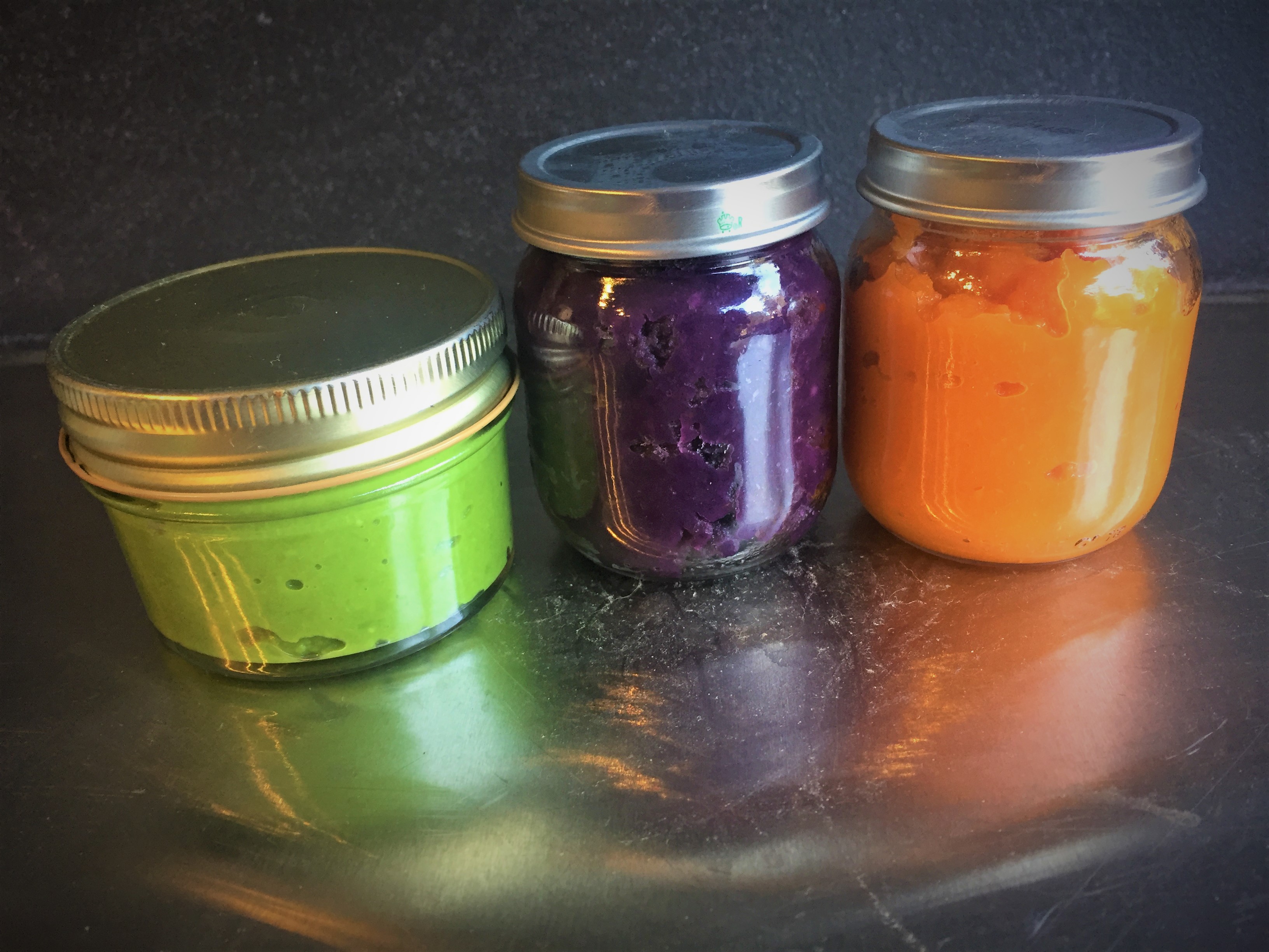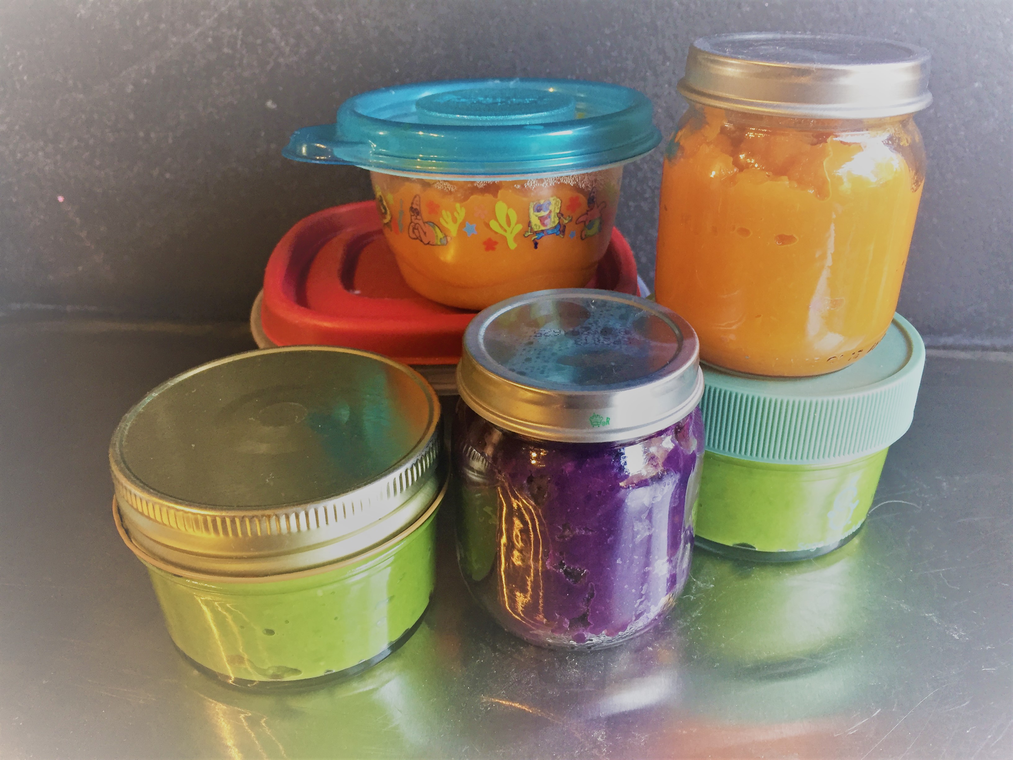 Boil veggie of choice in a little water until it’s soft, then puree in blender. Easy peasy!! We use either a NutriBullet or our Ninja. Remember – DO NOT throw out the water that you boiled the veggies in! Use this to help thin the puree. A lot of the nutrients are still in that water. When I move on to the next veggie/fruit, I will keep any water from the previous veggie/fruit in the pot and use it to boil the next batch. Waste not!