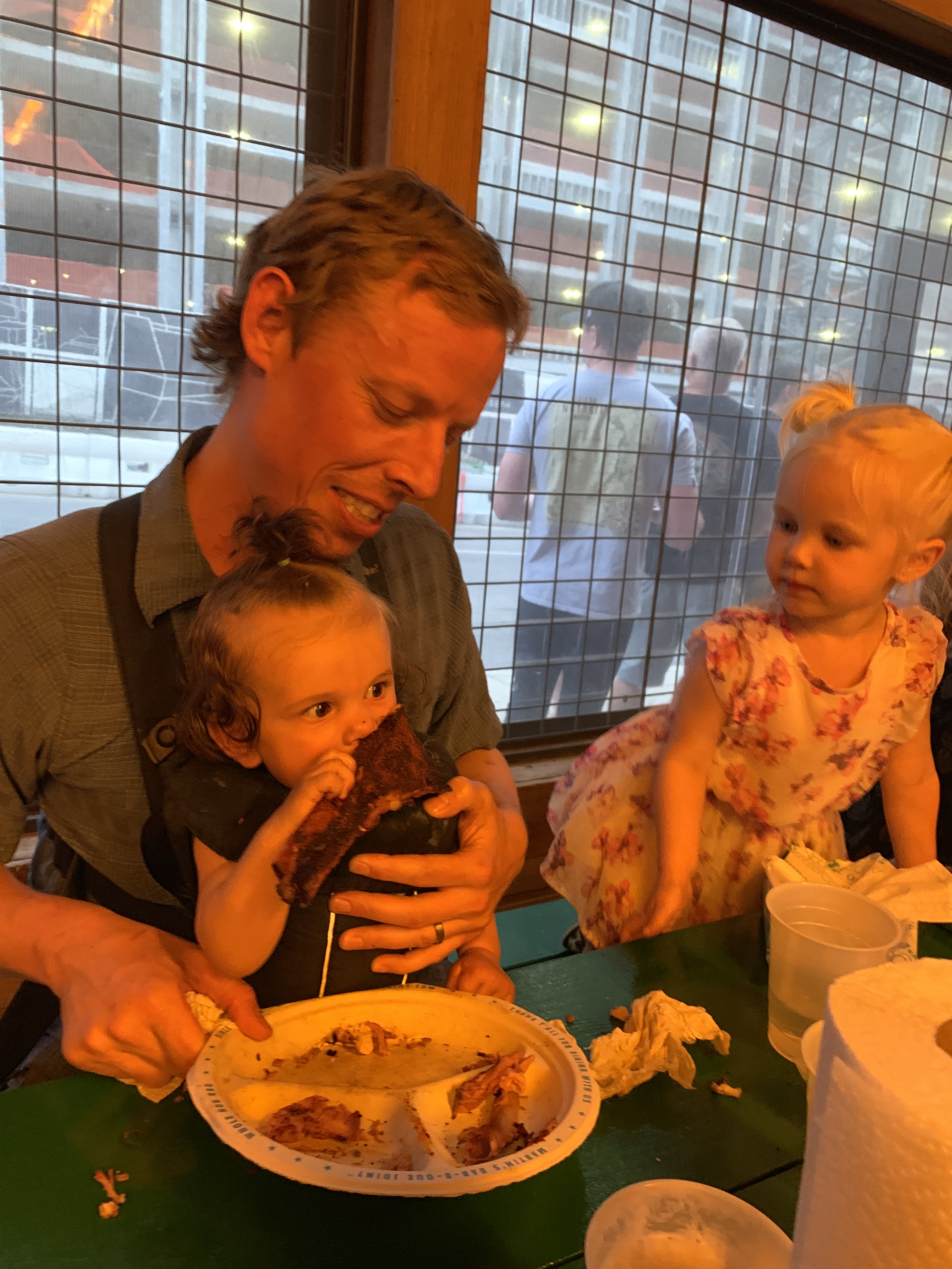 The two families were out downtown at a trendy and delicious restaurant called Martin’s BBQ. The kiddos were behaving well and our 8 month old was voraciously devouring all the meat she could get her hands on. Including a huge rib that she got hold of. It was amazing. But even more amazing was a major #parenting-fail that happened in the bathroom.