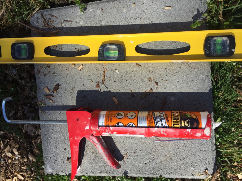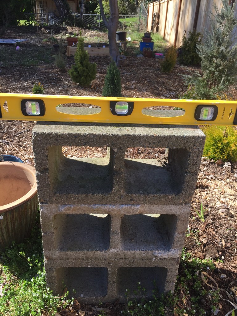2. Put some gravel down under the cinder block and check with level. You will want to compact the gravel, so I jumped on it a bit and that worked just fine. Once level, add additional blocks using contact adhesive.