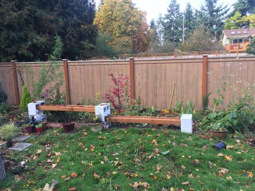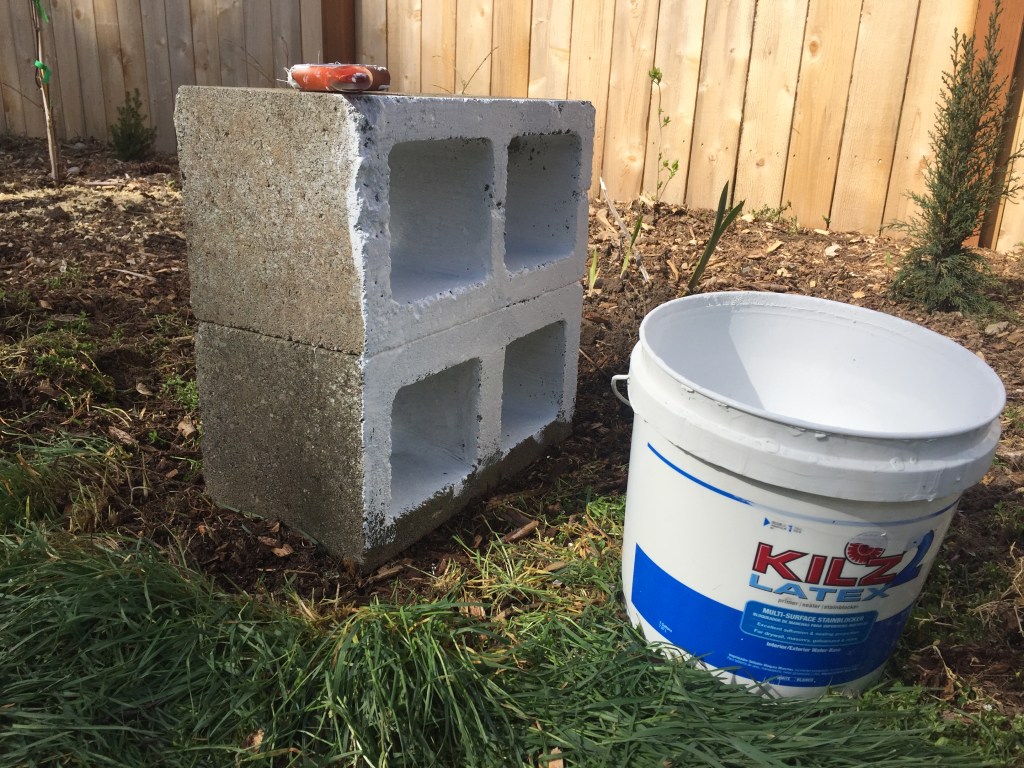 The previous homeowners were nice enough to leave a bunch of random treasures in our backyard, mostly hidden away in the ivy that once covered 1/2 of the space. I was able to find several concrete blocks that had two squares and flat sides. Perfect for making a bench!