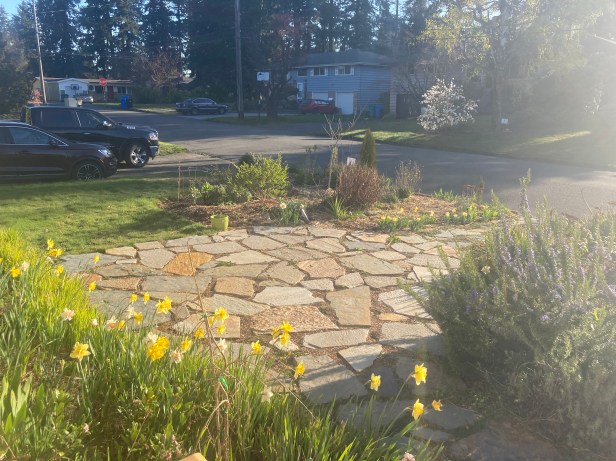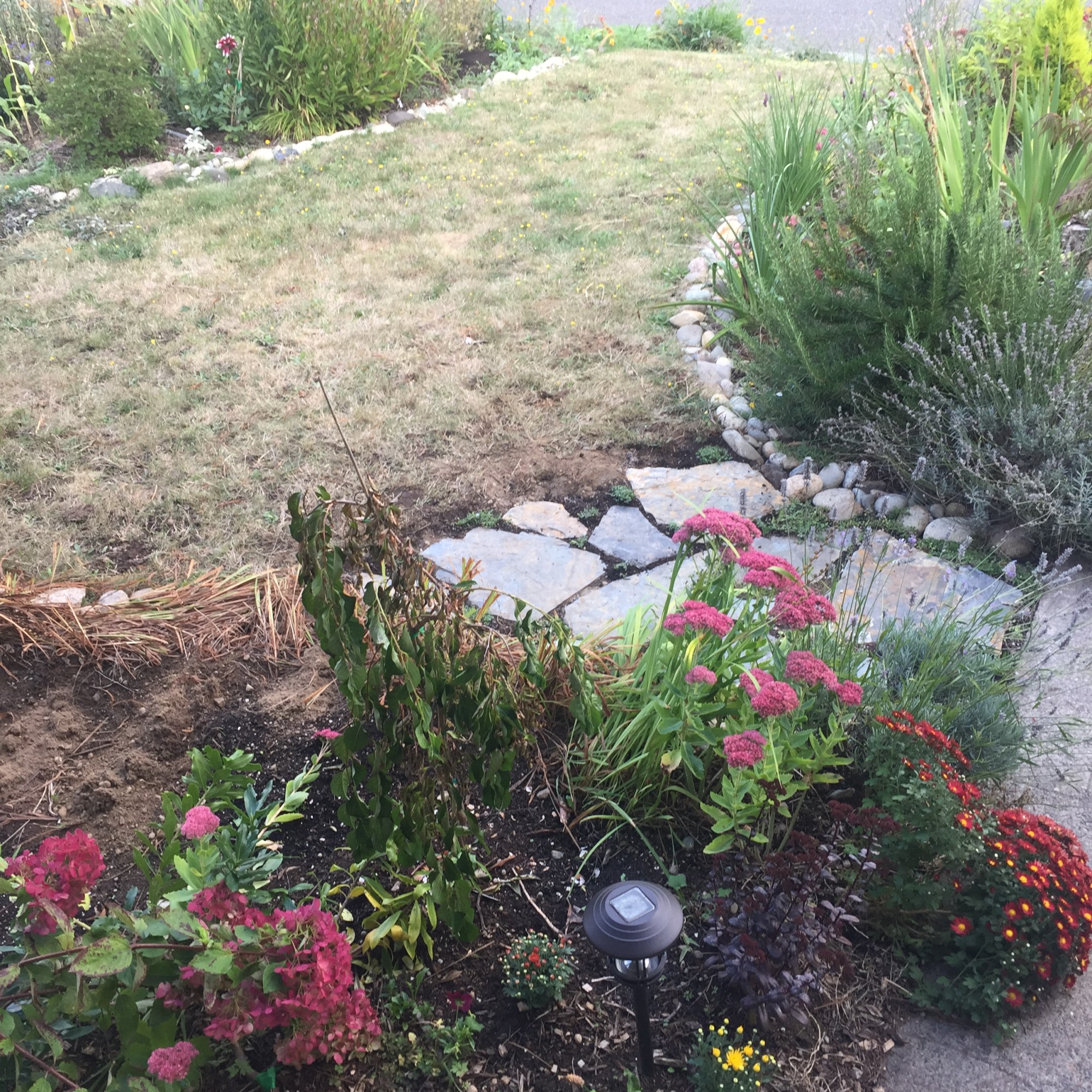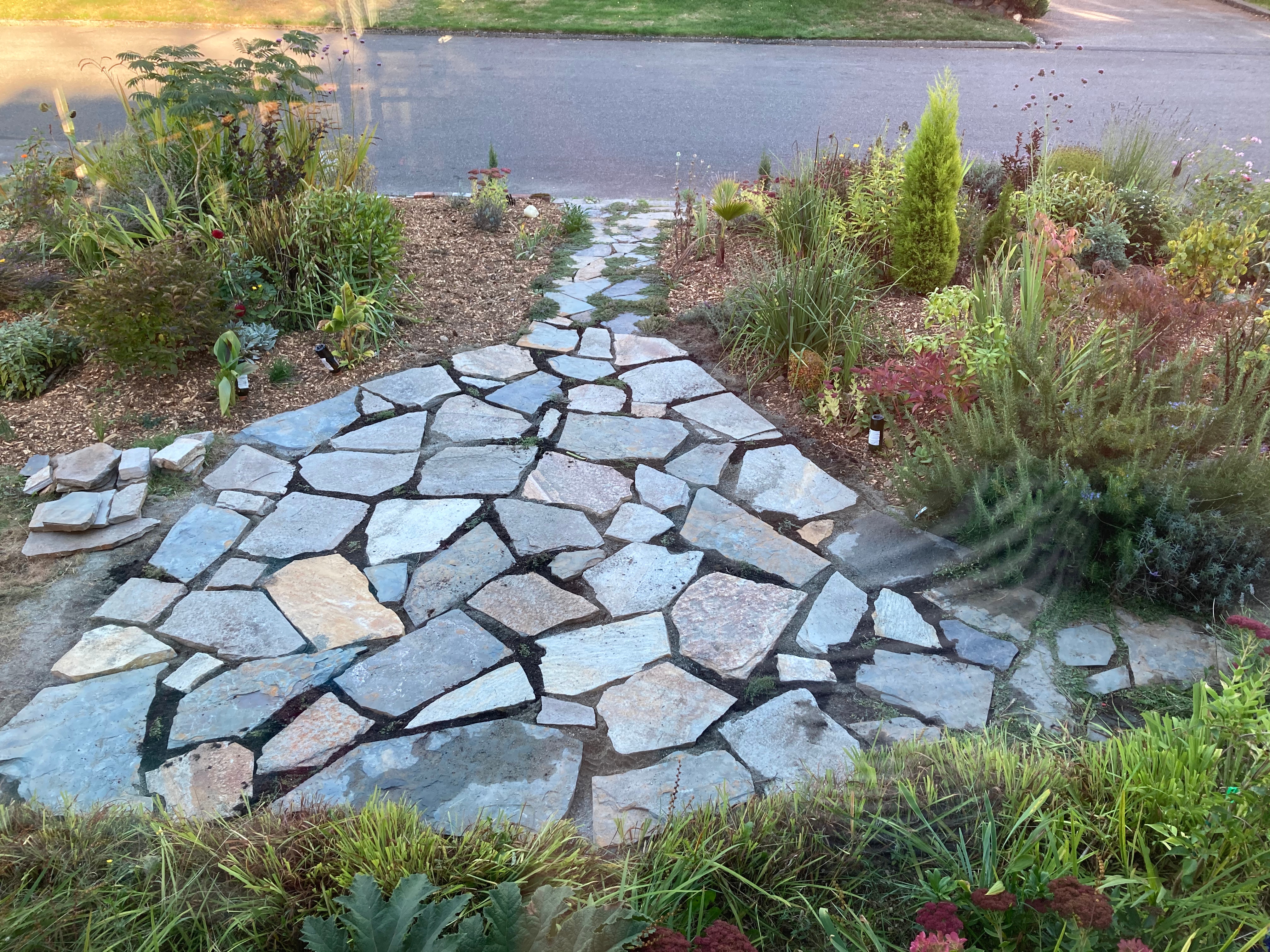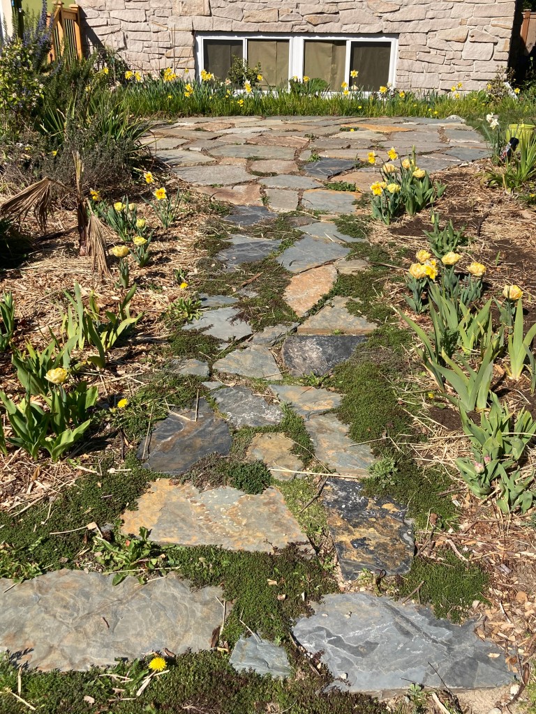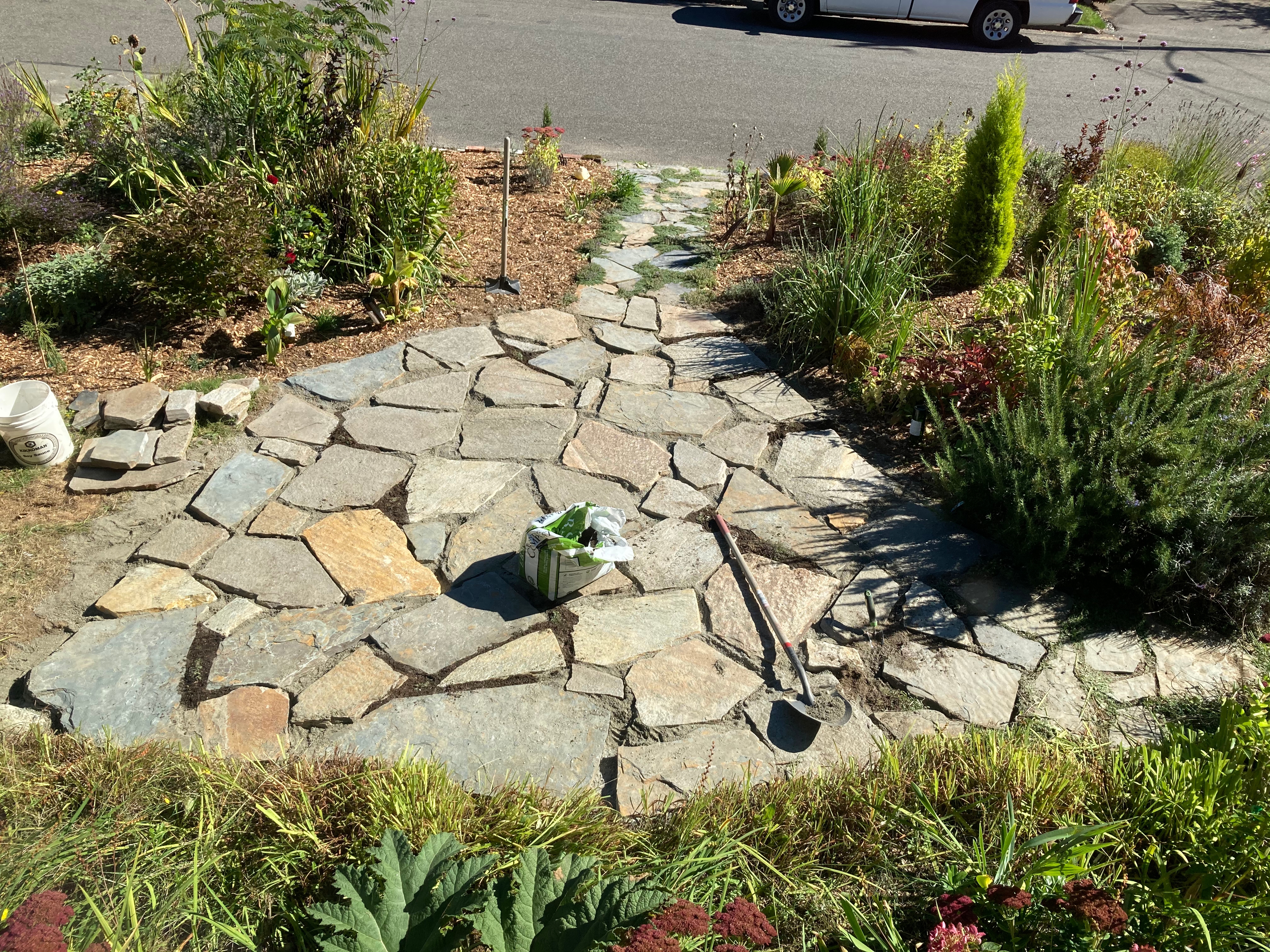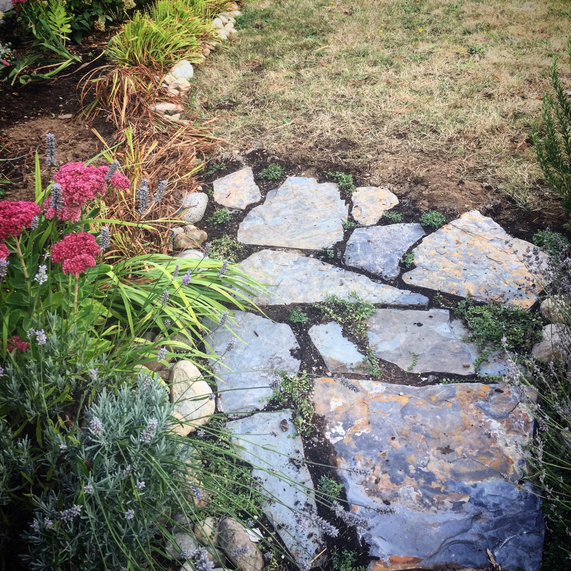 - I chose to add dirt and then some creeping thyme between the stones. I wanted to do this for several reasons. For one, I could have bigger gaps between the stones, and thus make the patio a little bigger for less cost. Second, I wouldn’t need to cut any of the stones since they didn’t need to have uniform sizes between them. A larger gap between some is actually ideal for placing the first of the creeping thyme and then it can spread through the smaller cracks over the years. The other reason for adding thyme between the stones is because I like the rustic look and I wanted this front yard to be as rain-wise and as pollinator friendly as possible. This helped achieve both of those goals.