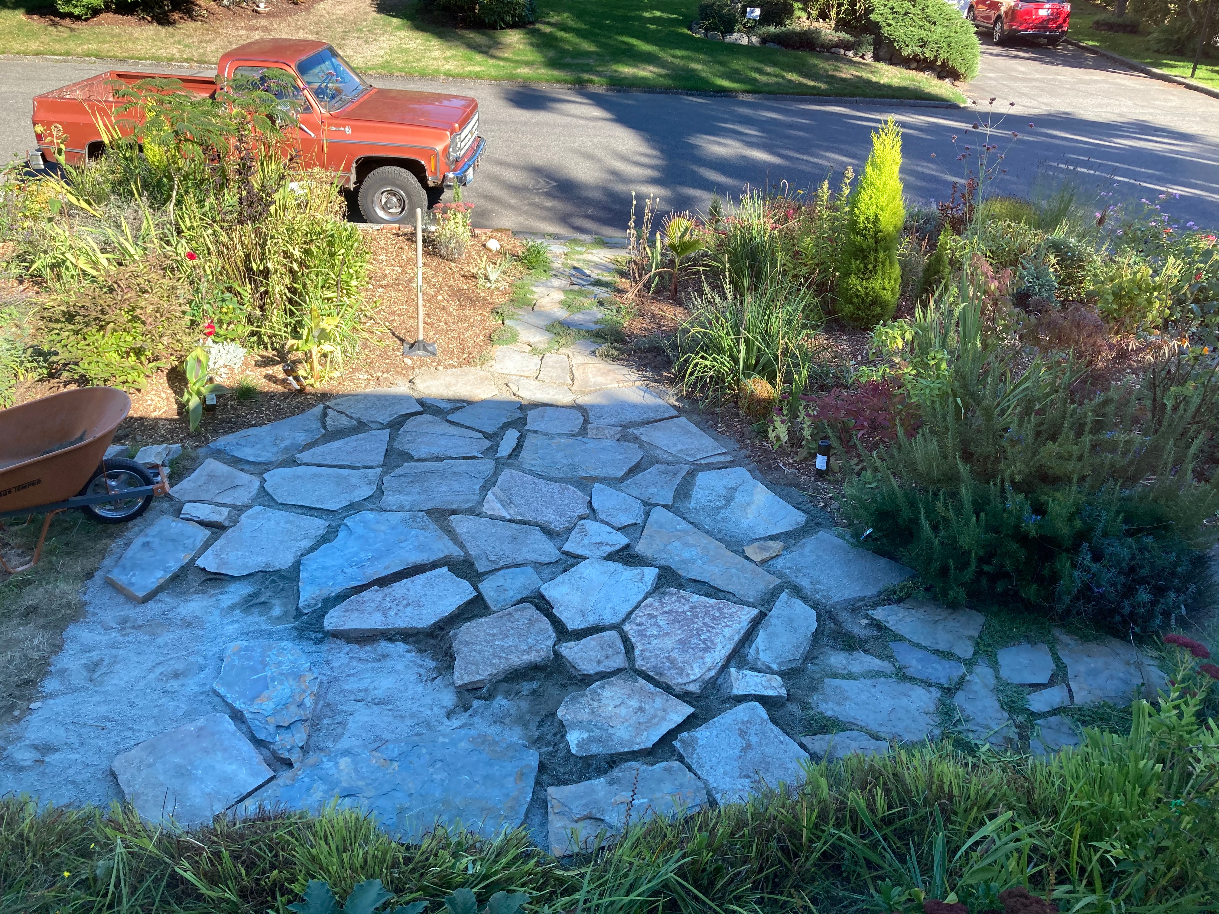 The stones from Craigslist were Quartzite and had a bronze, silvery shiny tone to them. Most of the stones in my paths thus far had been the Blue Flagstone, but I had acquired some small pieces of Quartzite for free along the way and had added that to the paths too, so I was actually looking forward to having a combination of both Quartzite and Blue Flagstone for the larger patio area as well.
