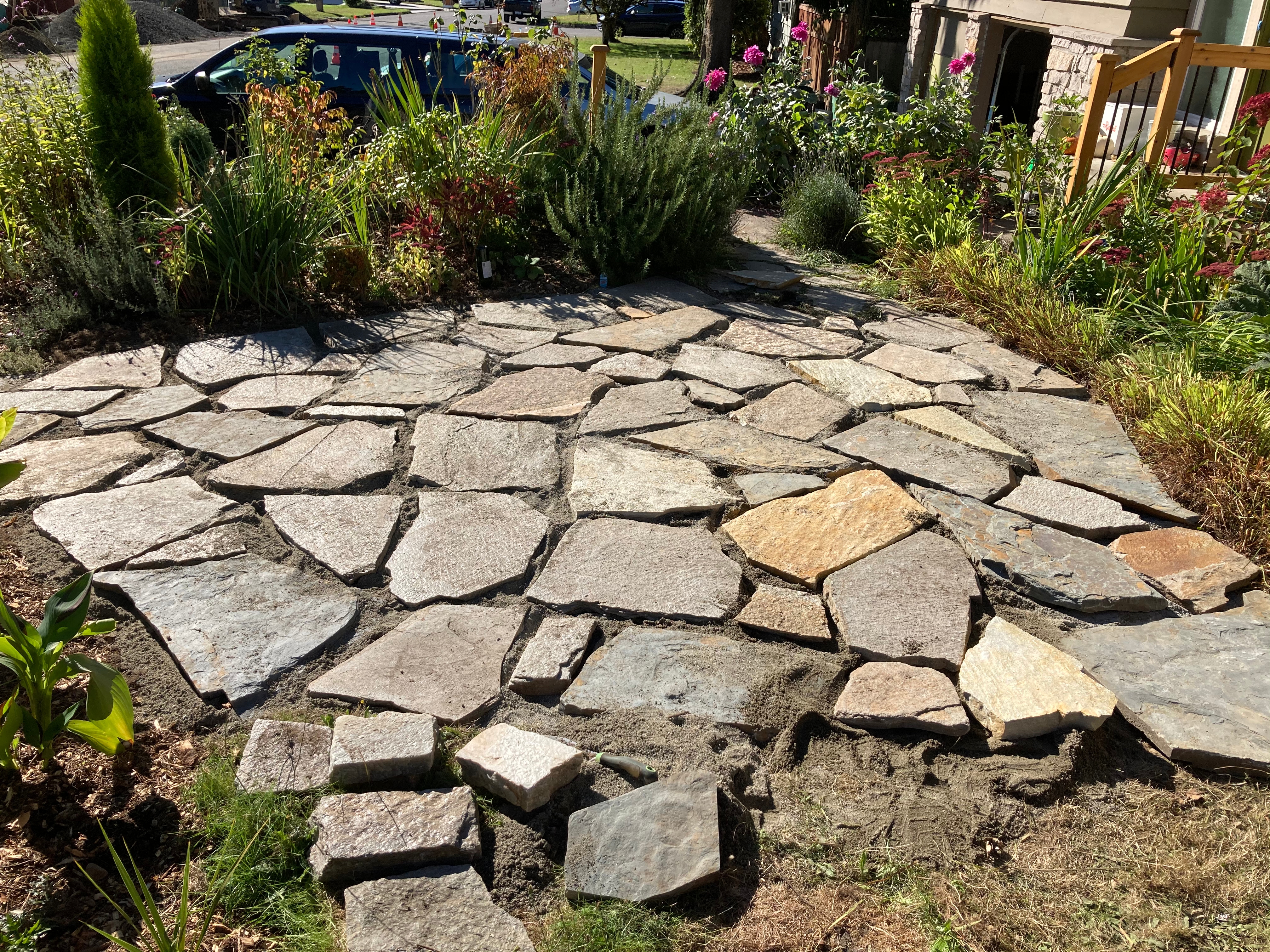Once the smaller pathways were mostly complete I was ready to buy some of the bigger stones for the bulk section of the patio. I measured the space and it came out to roughly 176 sq. ft. I checked with a few different stone yards and here is one of the responses I got regarding cost: “The variegated blue is $525/ton and the true blue is $925/ton. You would need approximately 2 tons to cover the 176 sq. ft. There is also a Spar Peak which is slate sourced from Montana and that has a blue/green hue to it and that is $560/ton.”