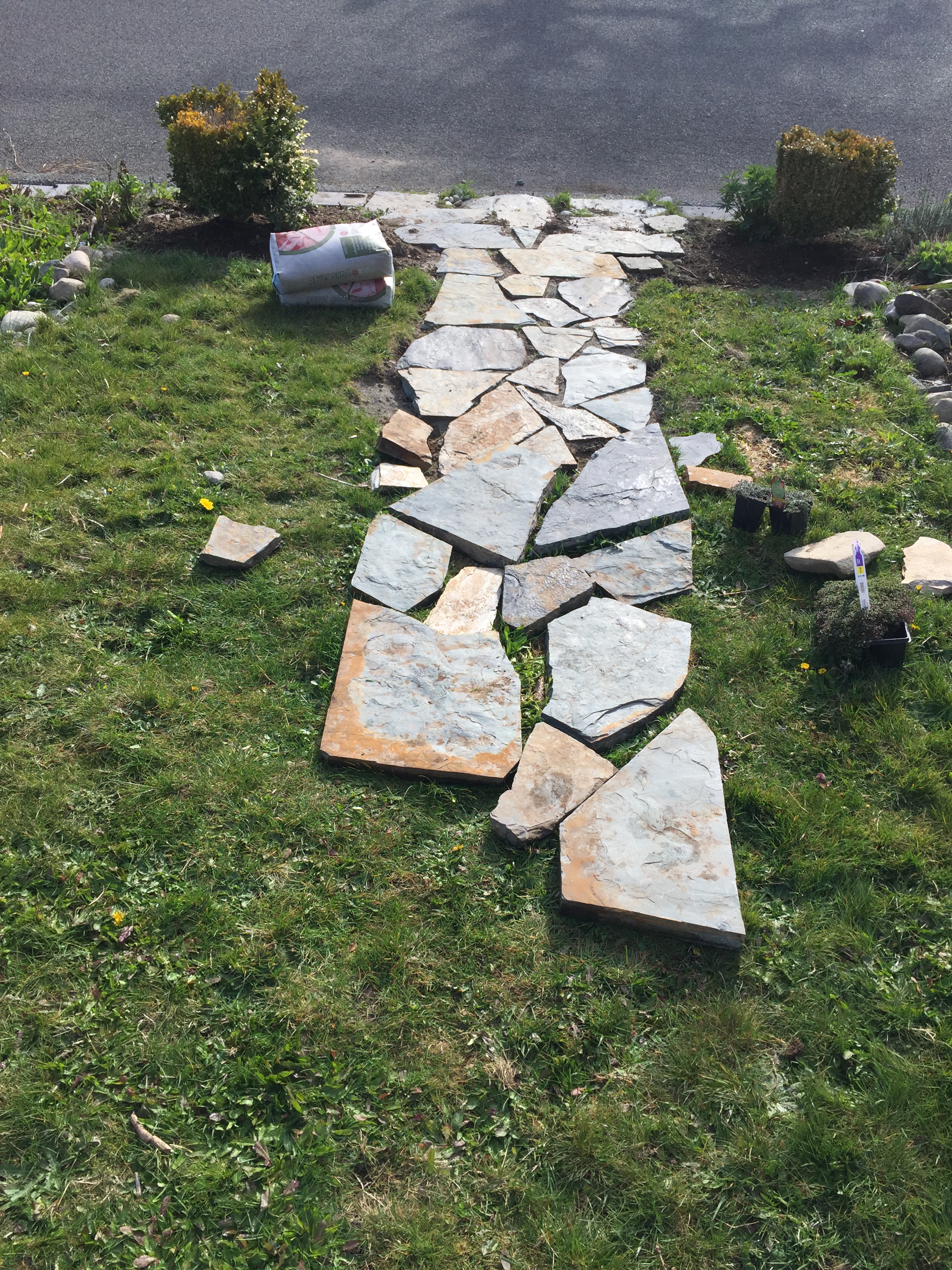 - A few things are worth noting here. I knew I wasn’t going to be adding any concrete or anything solid underneath or between the stones, so I wasn’t that concerned if the stones weren’t perfectly level. This also meant I didn’t need to worry about placing the stones on the same gradual slope for drainage as the water would be able to drain between the stones. I did, however place them all sloping a tiny bit down towards the street so water wouldn’t puddle on the individual stones.