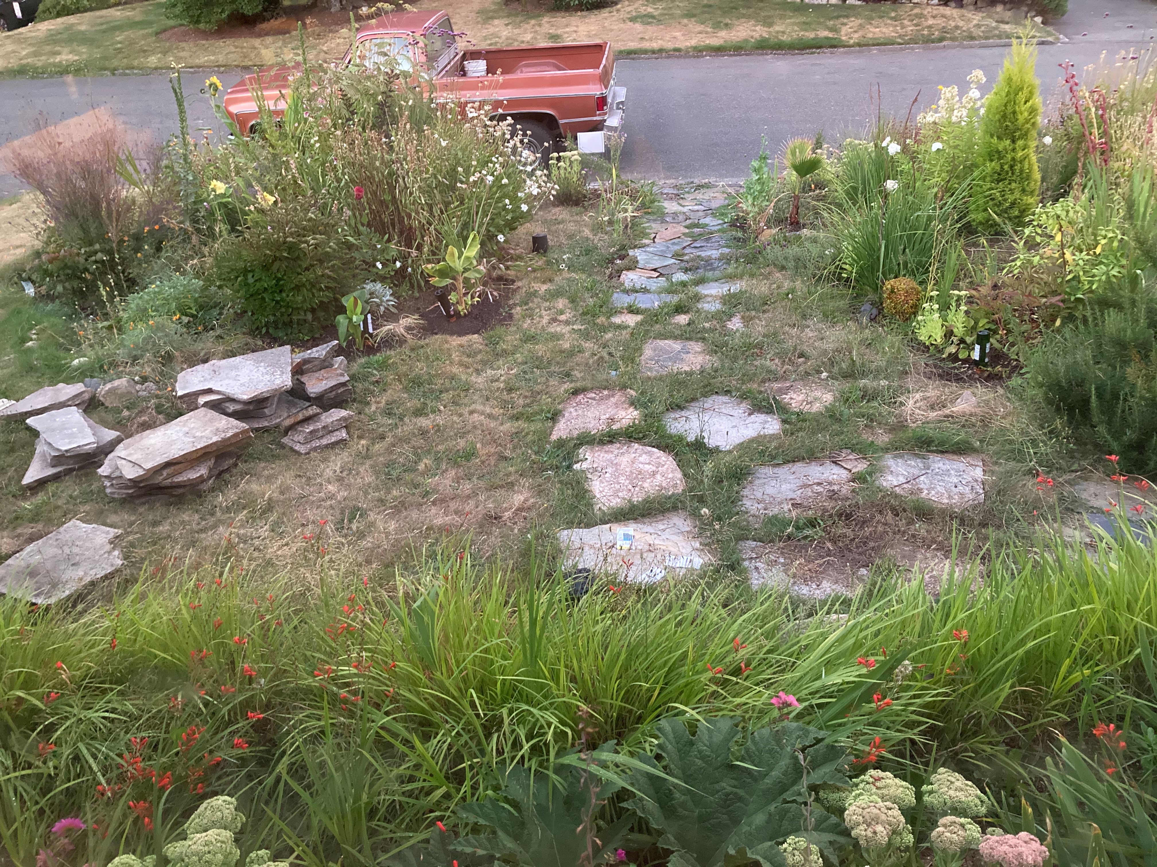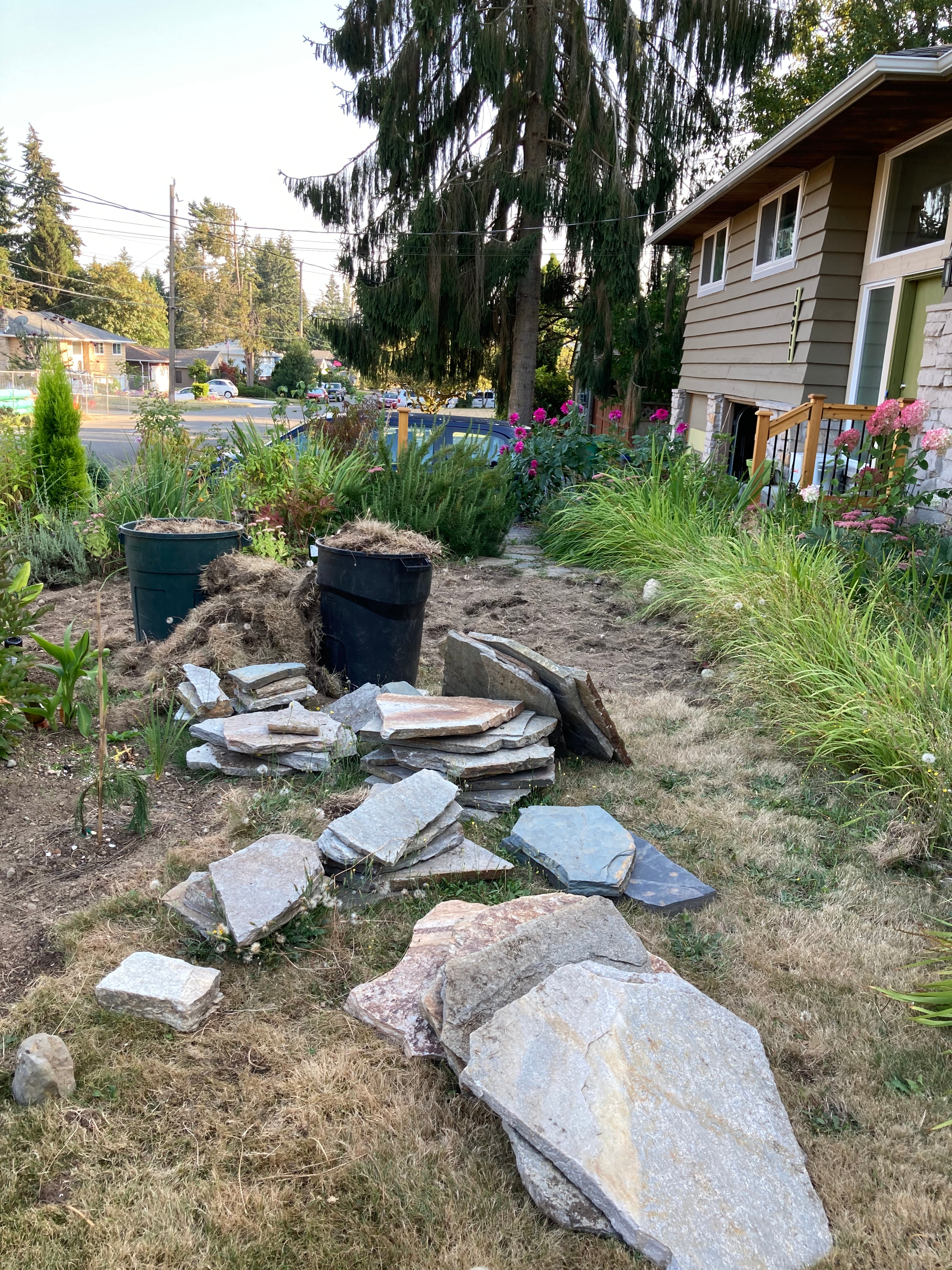 In May I found my first batch of of 12 large stones for $250 on Facebook Marketplace. These were about 1.5-2 ft wide whereas the Home Depot stones I used in the paths were more like 1-1.5 ft diameter. The price seemed a little high, but the stones I was getting from Home Depot were $10 for a large stone, and these were about $20 per stone, so it was roughly on par with pricing. I was fine with the price, but a little bummed that I didn’t get a screaming deal.