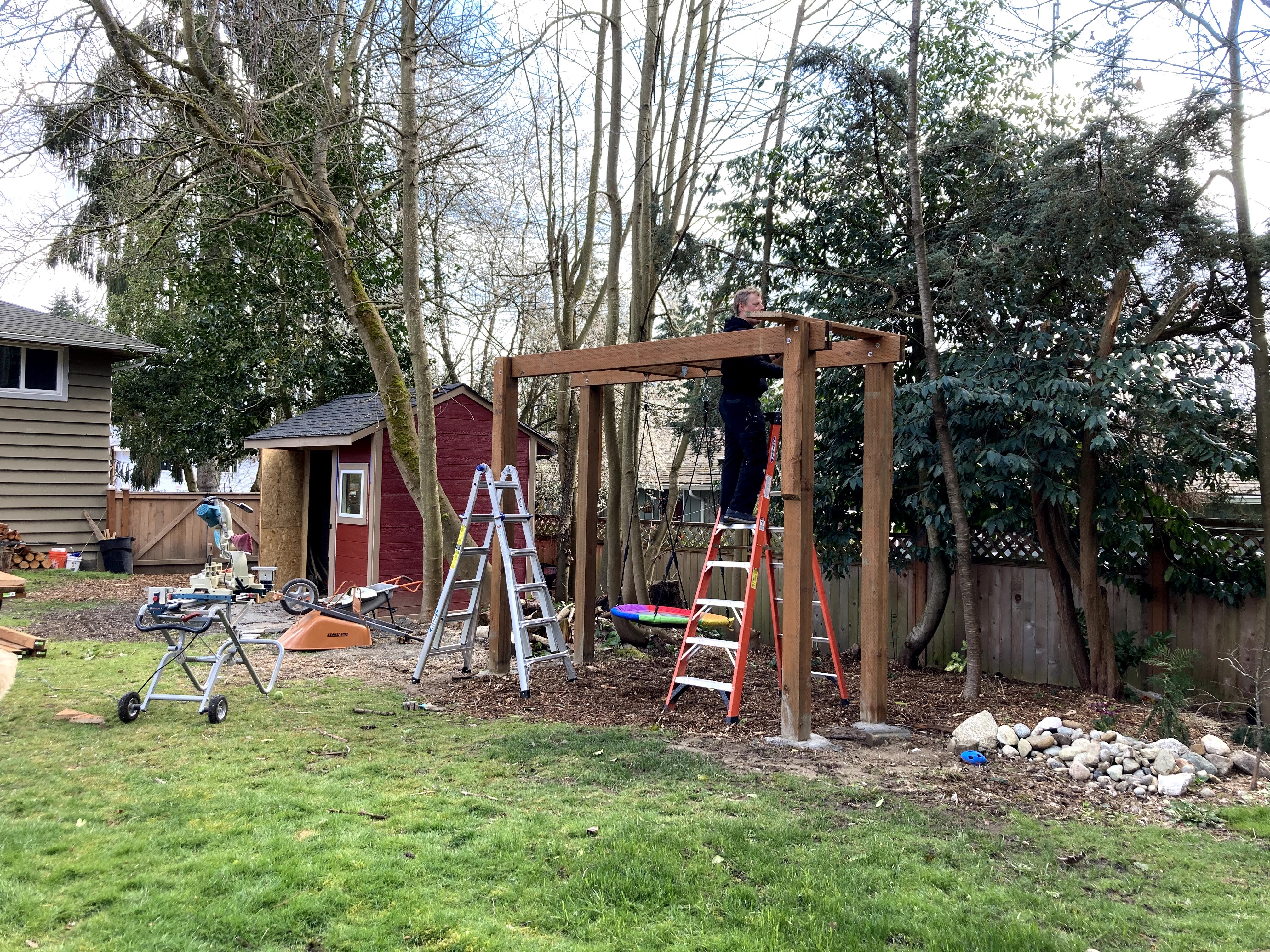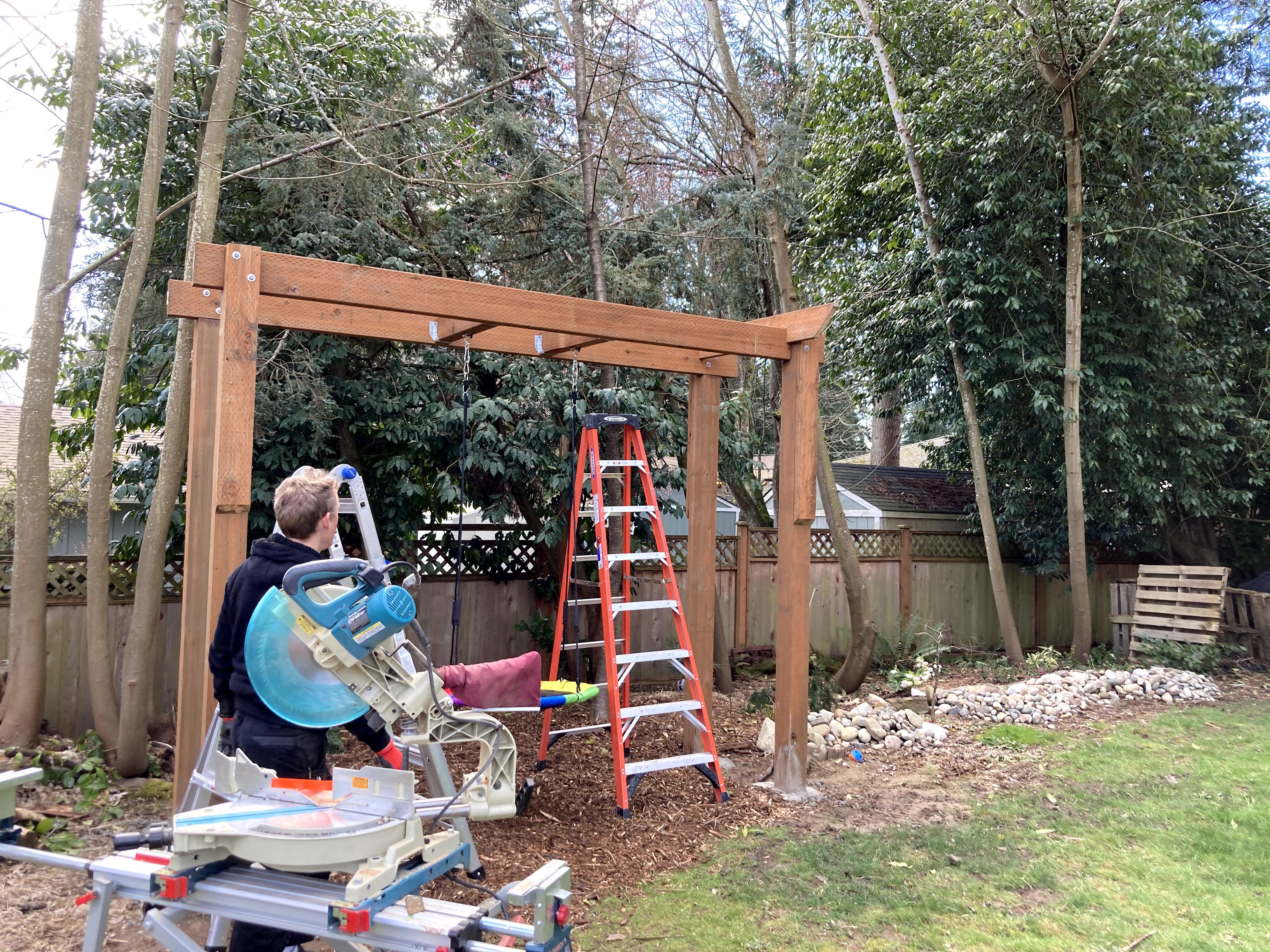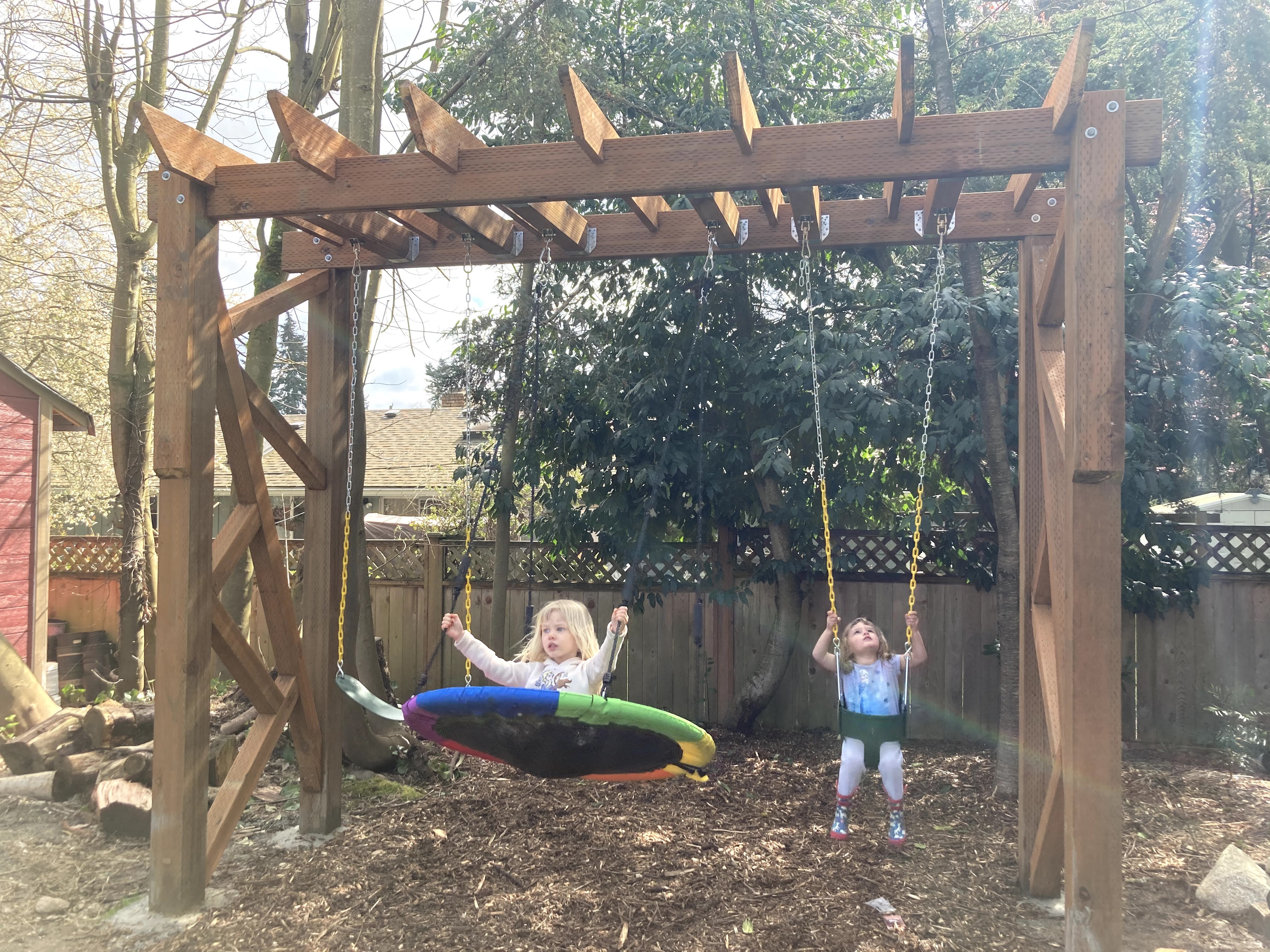 My husband, Jon, was very focused on safety and stability, so he wanted to build an A frame. I was much more interested in aesthetics and long-term functionality in our yard, so I wanted one that looked like a trellis. My rational was that when the girls got a little older and didn’t use the swings anymore, we could hang hammock swings or hanging rattan chairs or even two hammocks between this structure in the summer time for a relaxing and attractive reading nook in the shady section of our yard. Although an A frame would have been cheaper, easier and potentially sturdier, I was able to convince my husband to go for the prettier, multi-purpose build.