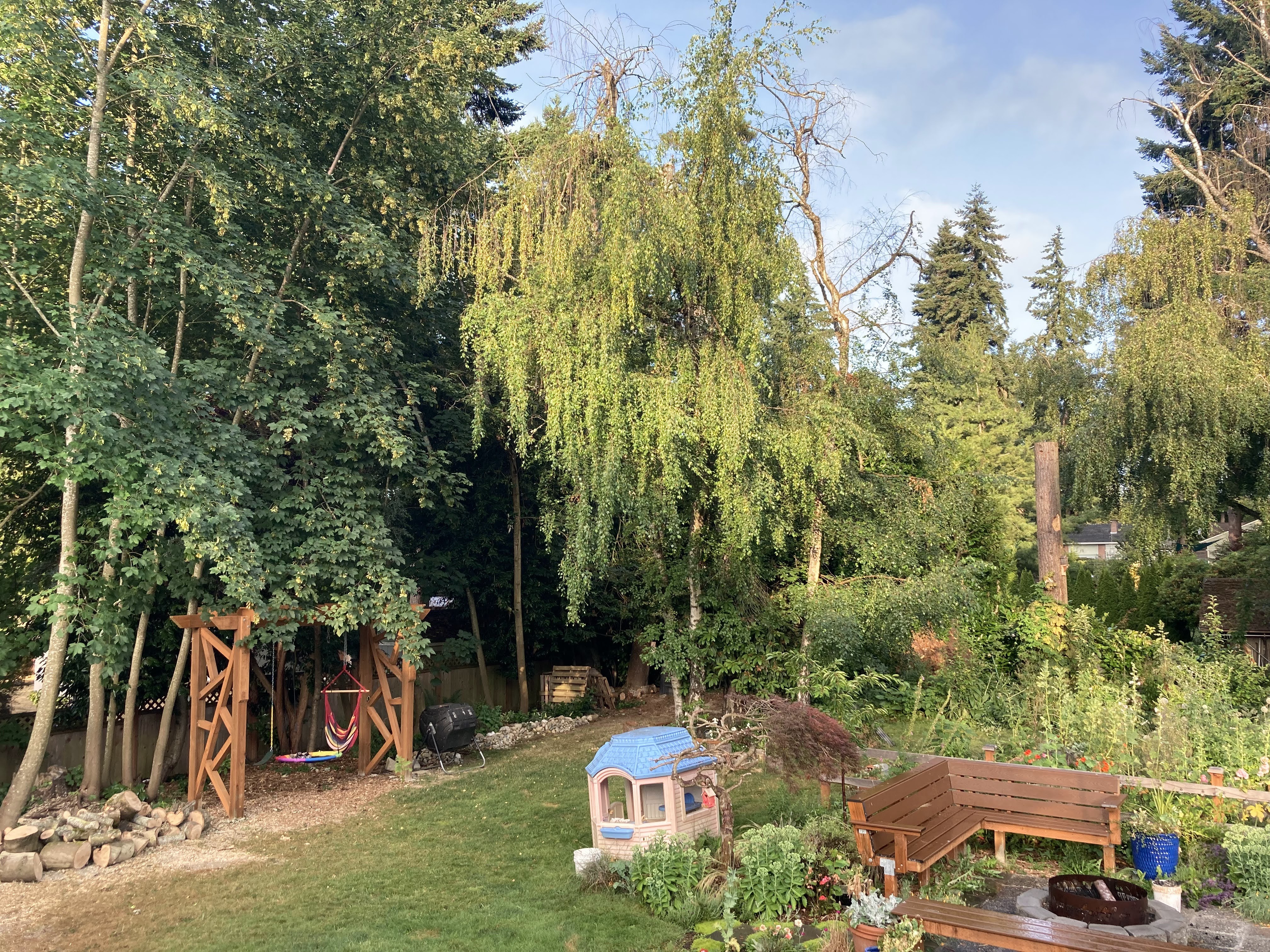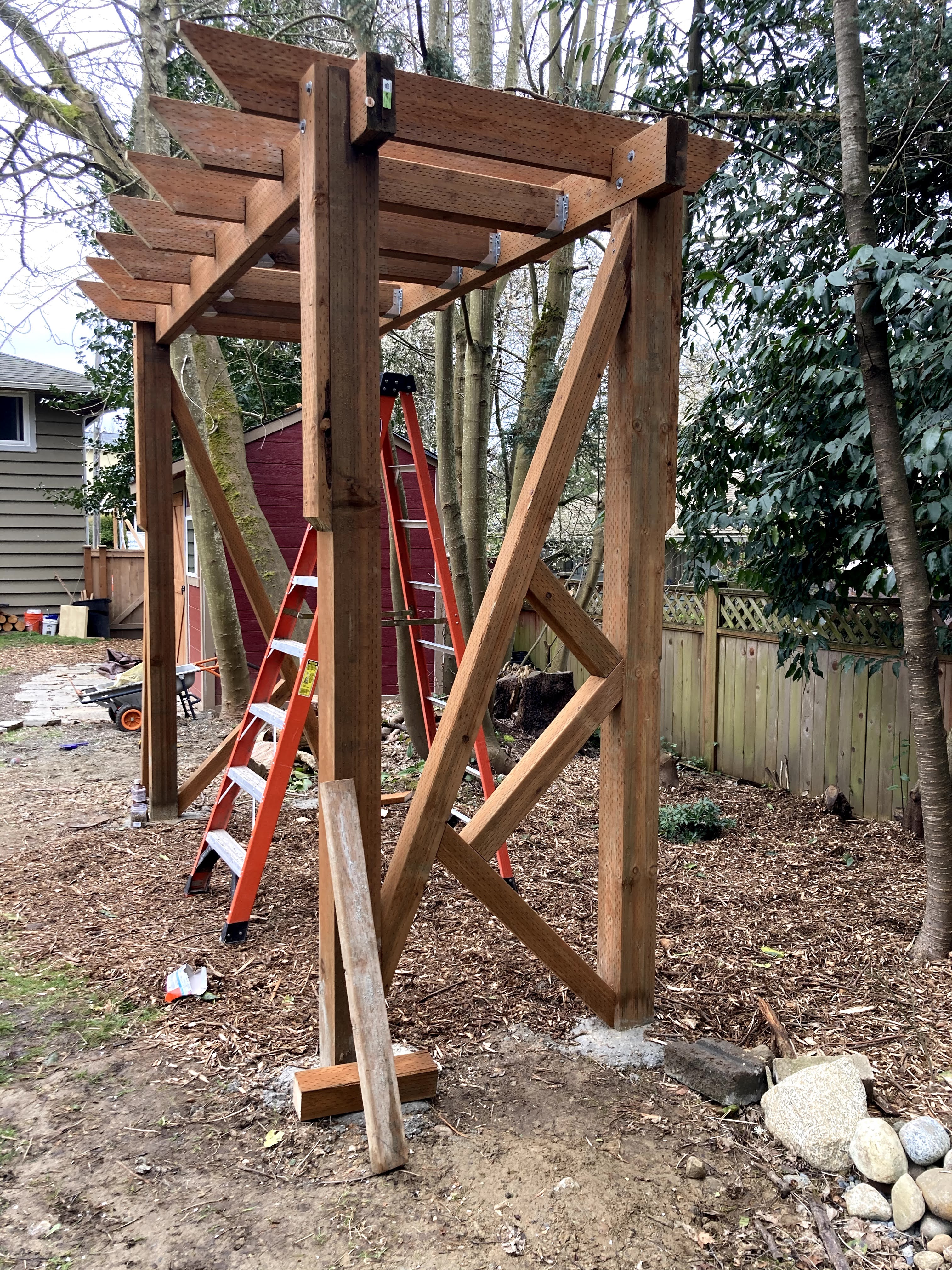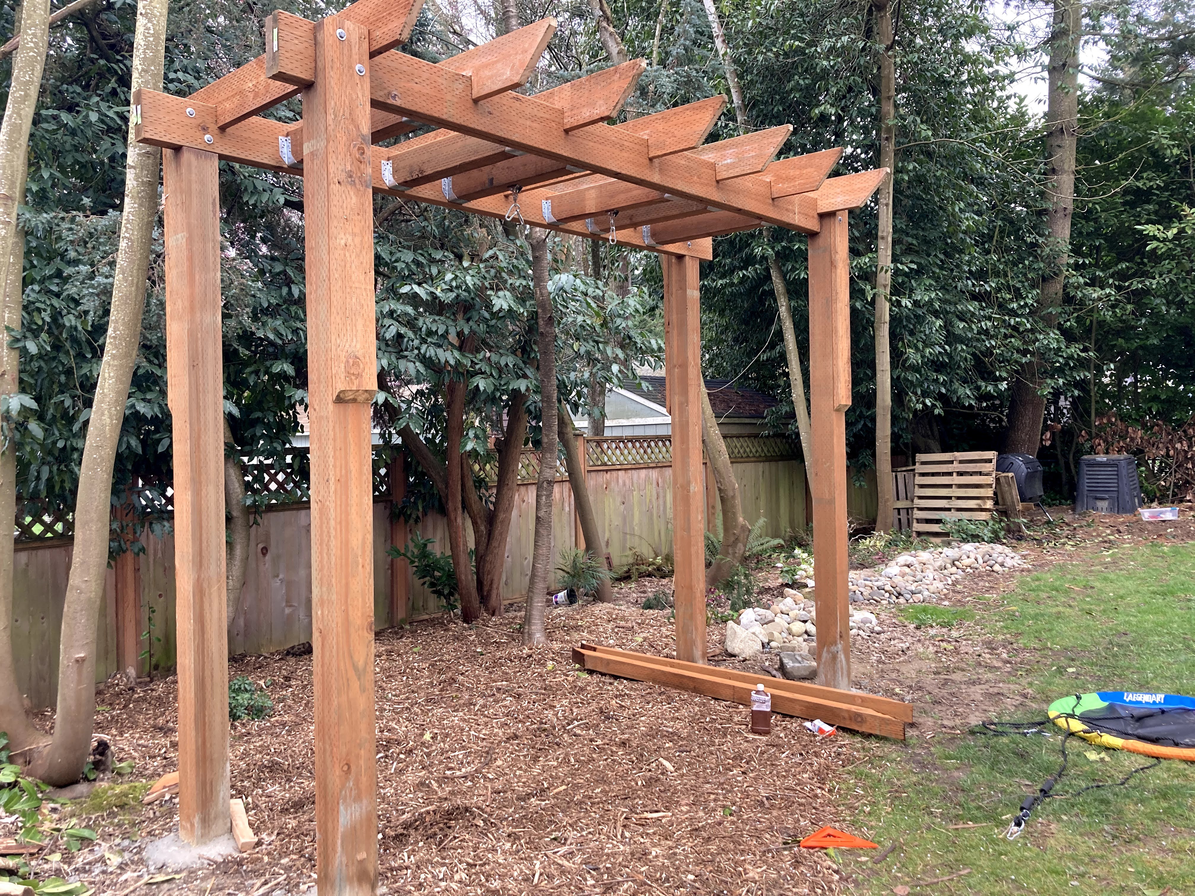 My husband, Jon, was very focused on safety and stability, so he wanted to build an A frame. I was much more interested in aesthetics and long-term functionality in our yard, so I wanted one that looked like a trellis. My rational was that when the girls got a little older and didn’t use the swings anymore, we could hang hammock swings or hanging rattan chairs or even two hammocks between this structure in the summer time for a relaxing and attractive reading nook in the shady section of our yard. Although an A frame would have been cheaper, easier and potentially sturdier, I was able to convince my husband to go for the prettier, multi-purpose build.