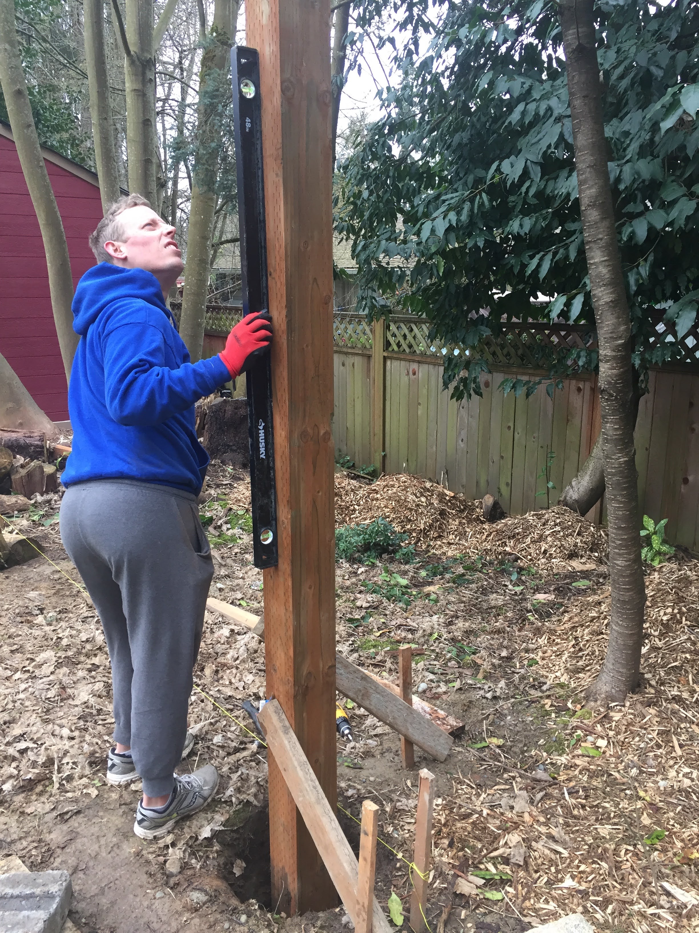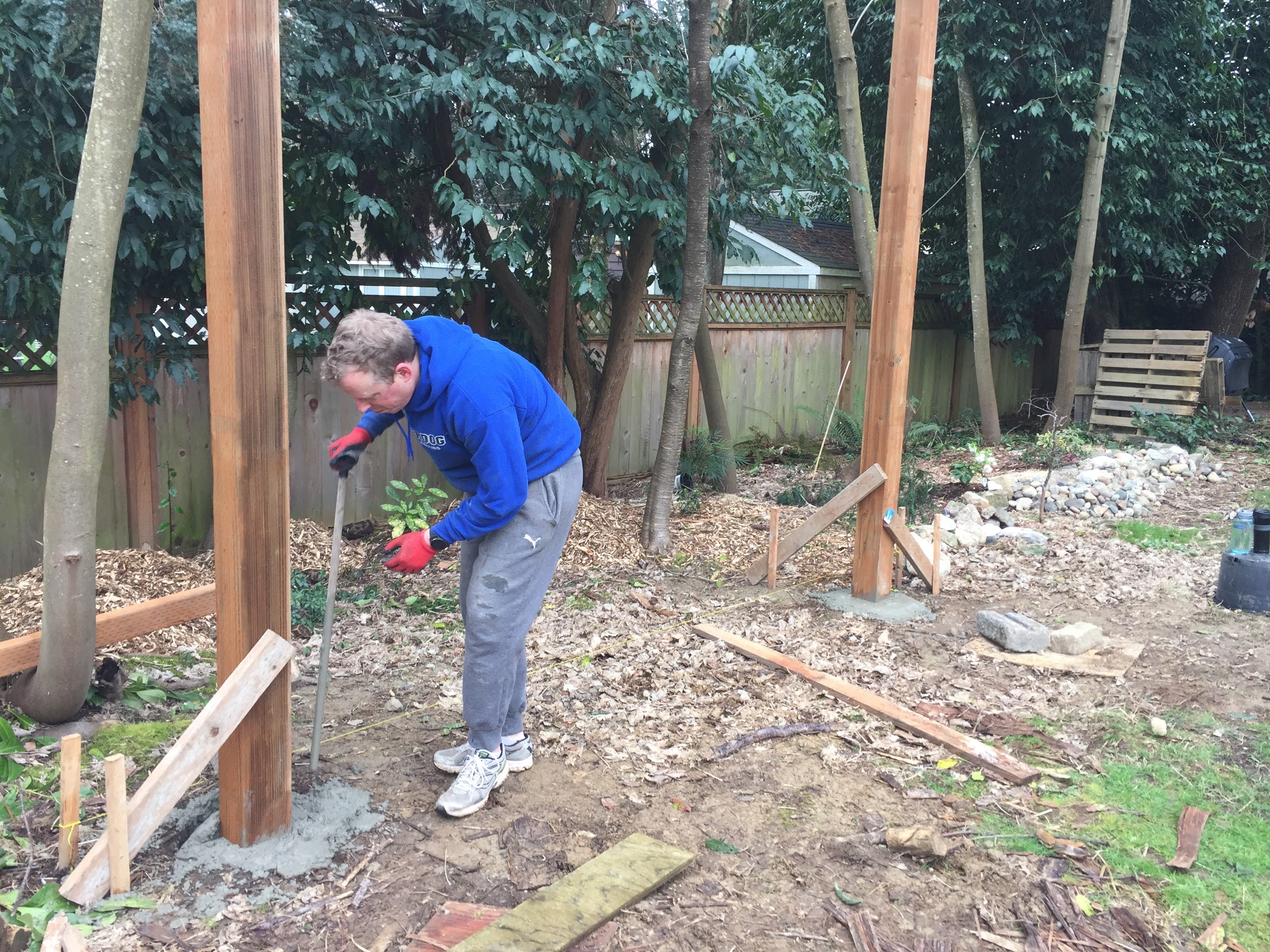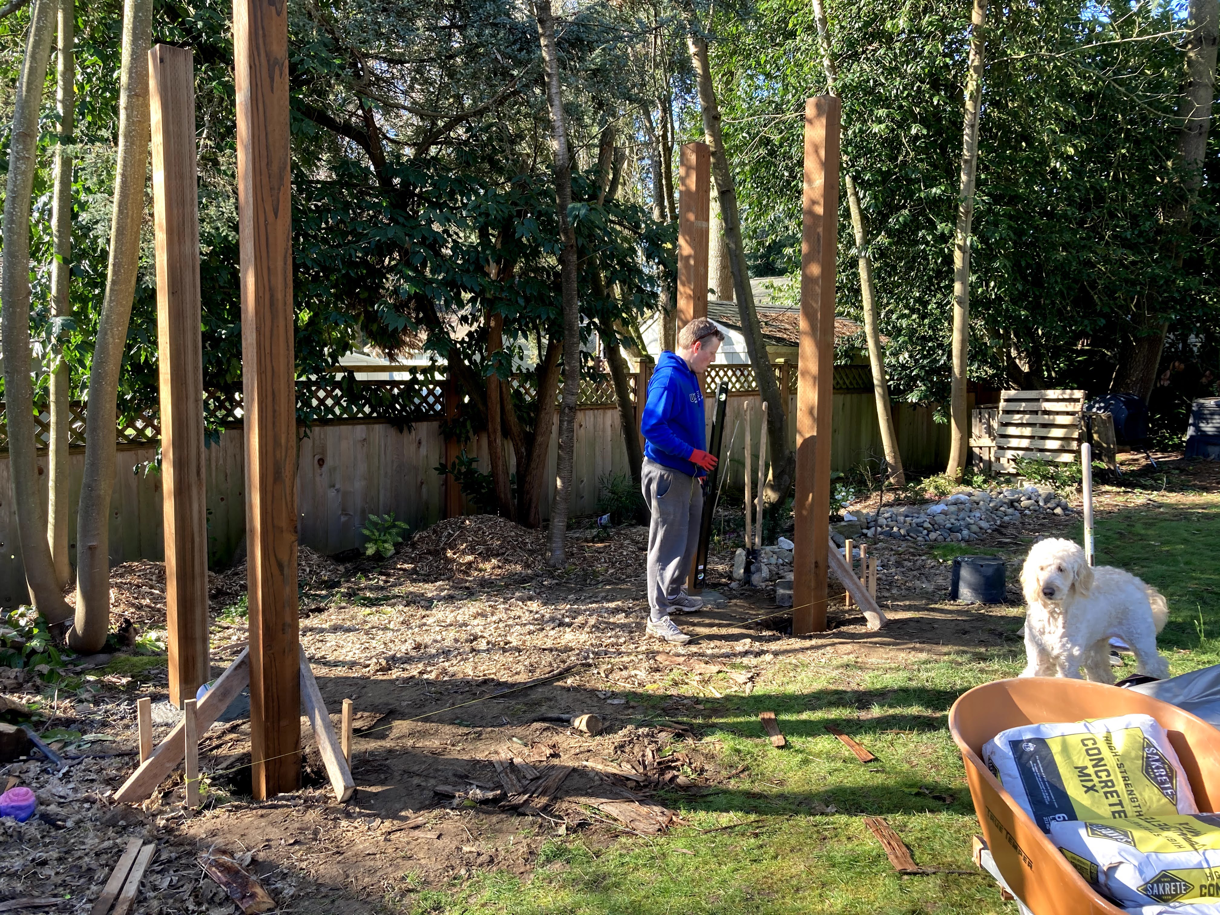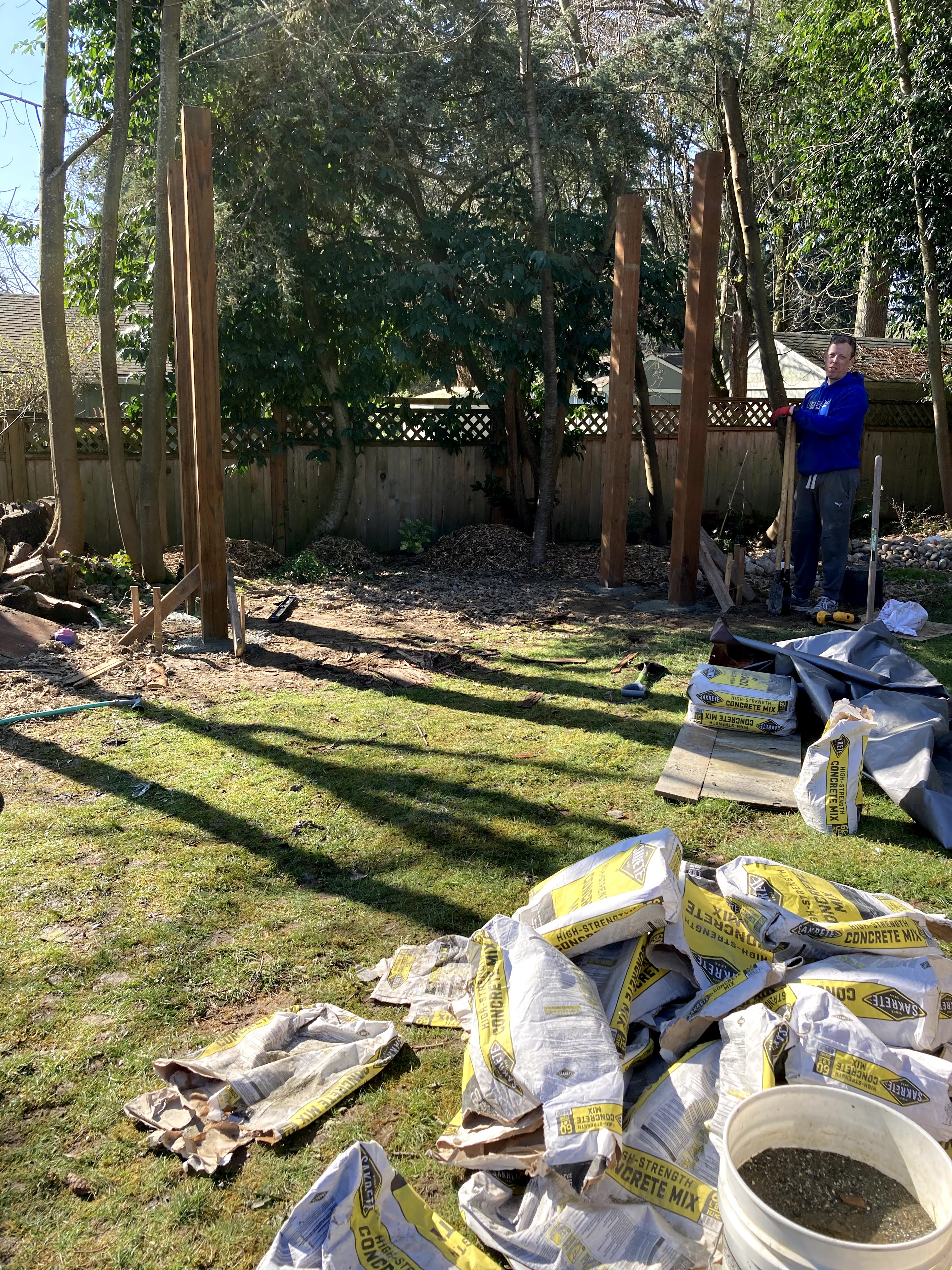 The first step was measuring the area and setting the posts in concrete. We used pressure treated 6×6 12 ft posts. My husband very proudly informed me that this is the size posts that are holding up our house. Did I mention my husband likes to make sure things are sturdy?