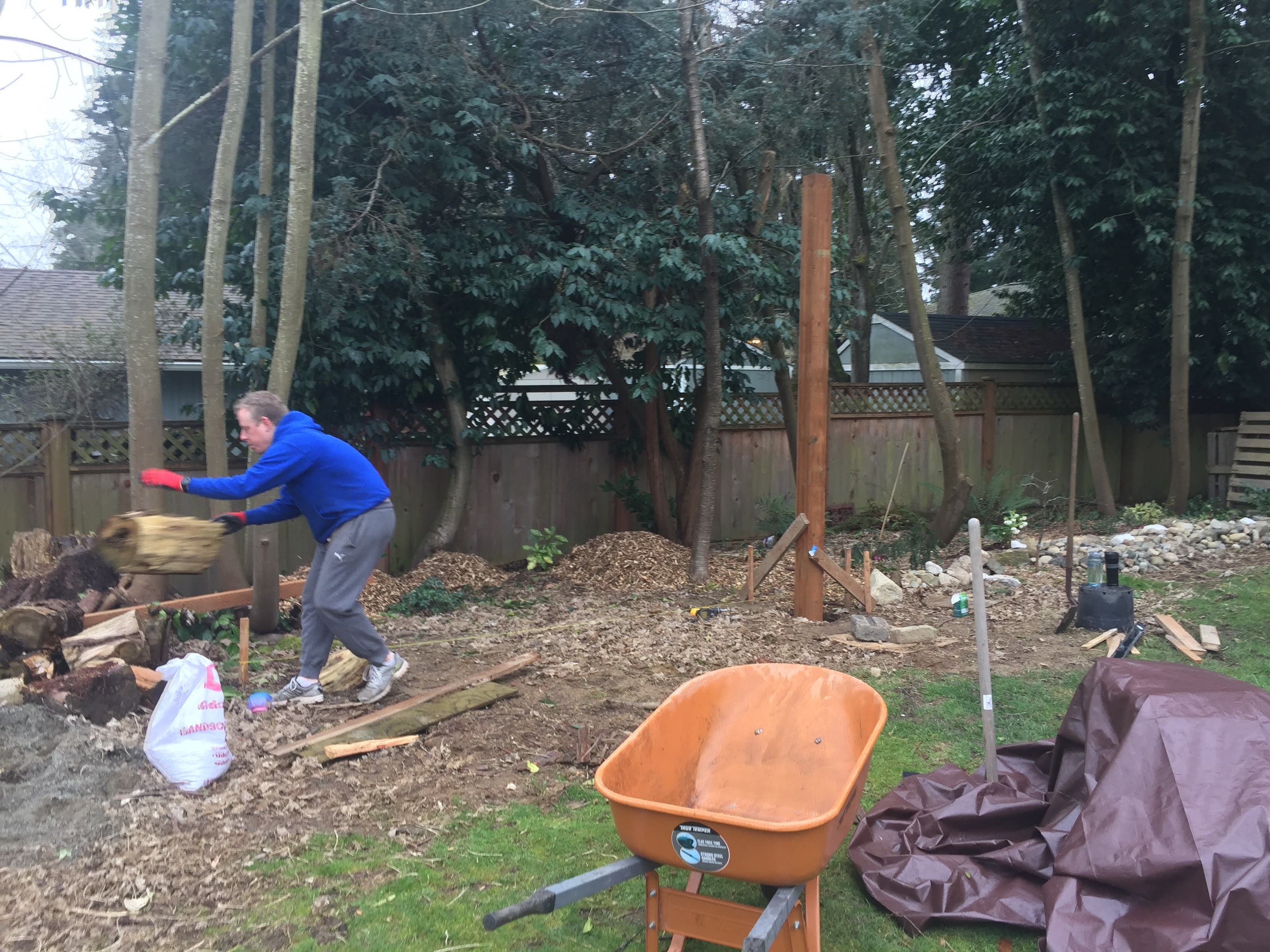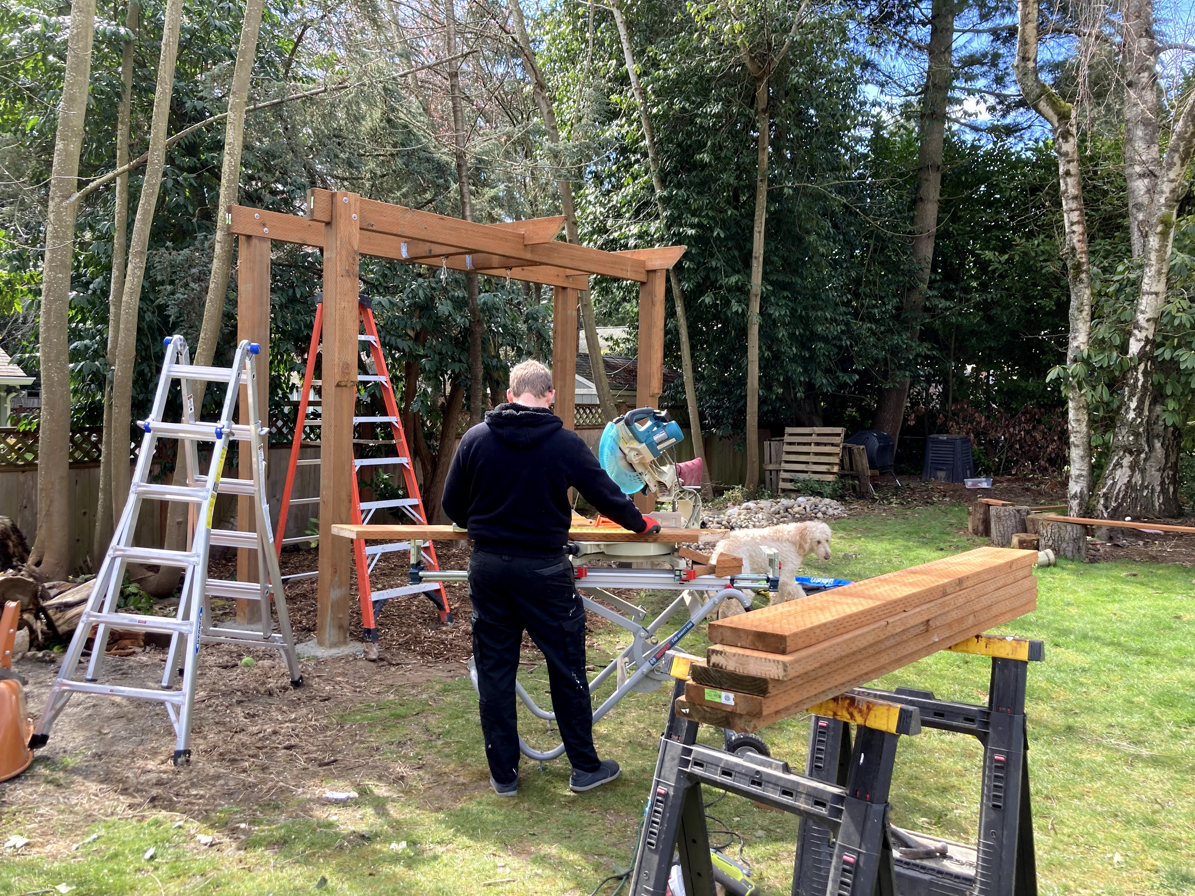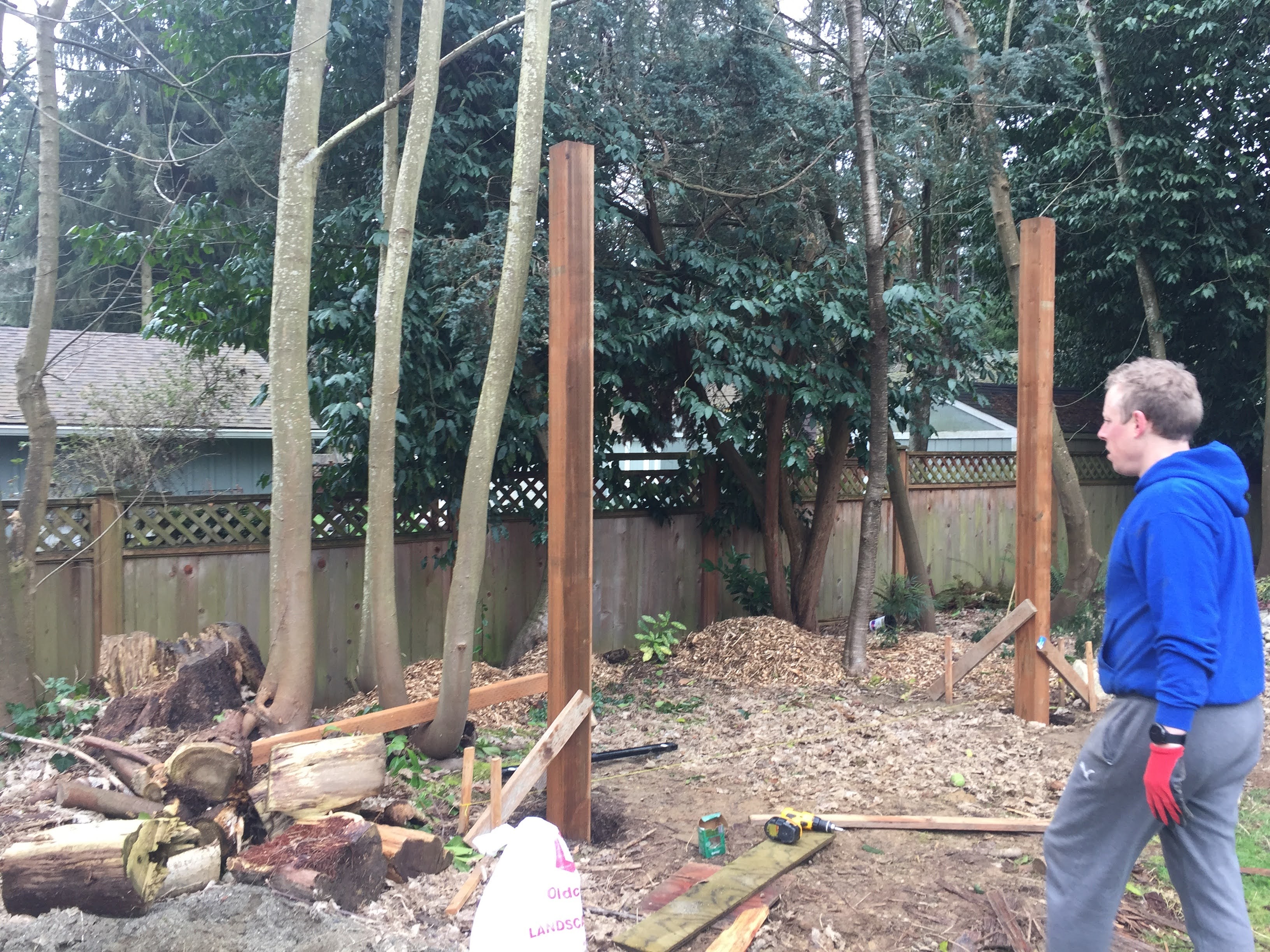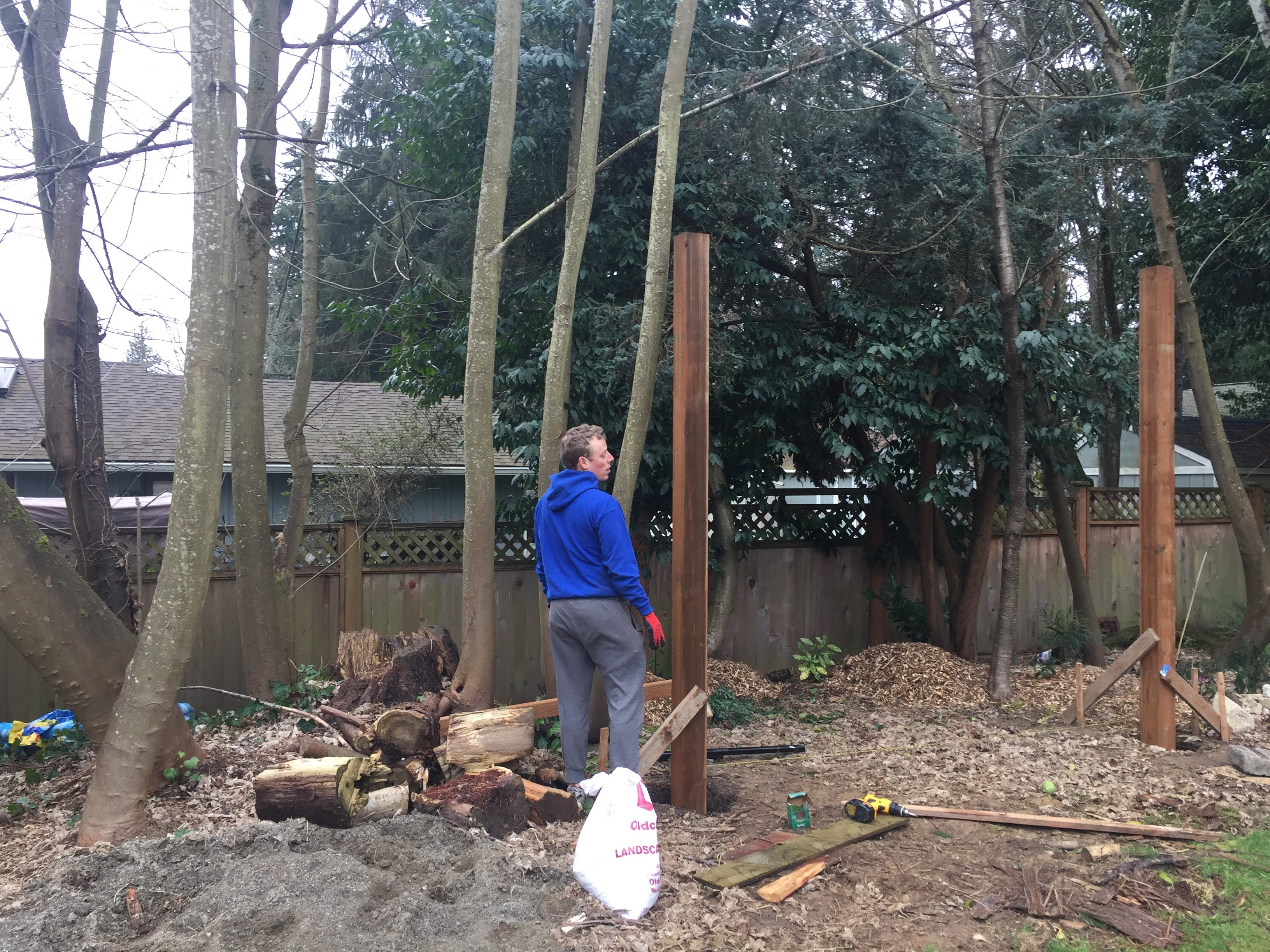 The first step was measuring the area and setting the posts in concrete. We used pressure treated 6×6 12 ft posts. My husband very proudly informed me that this is the size posts that are holding up our house. Did I mention my husband likes to make sure things are sturdy?