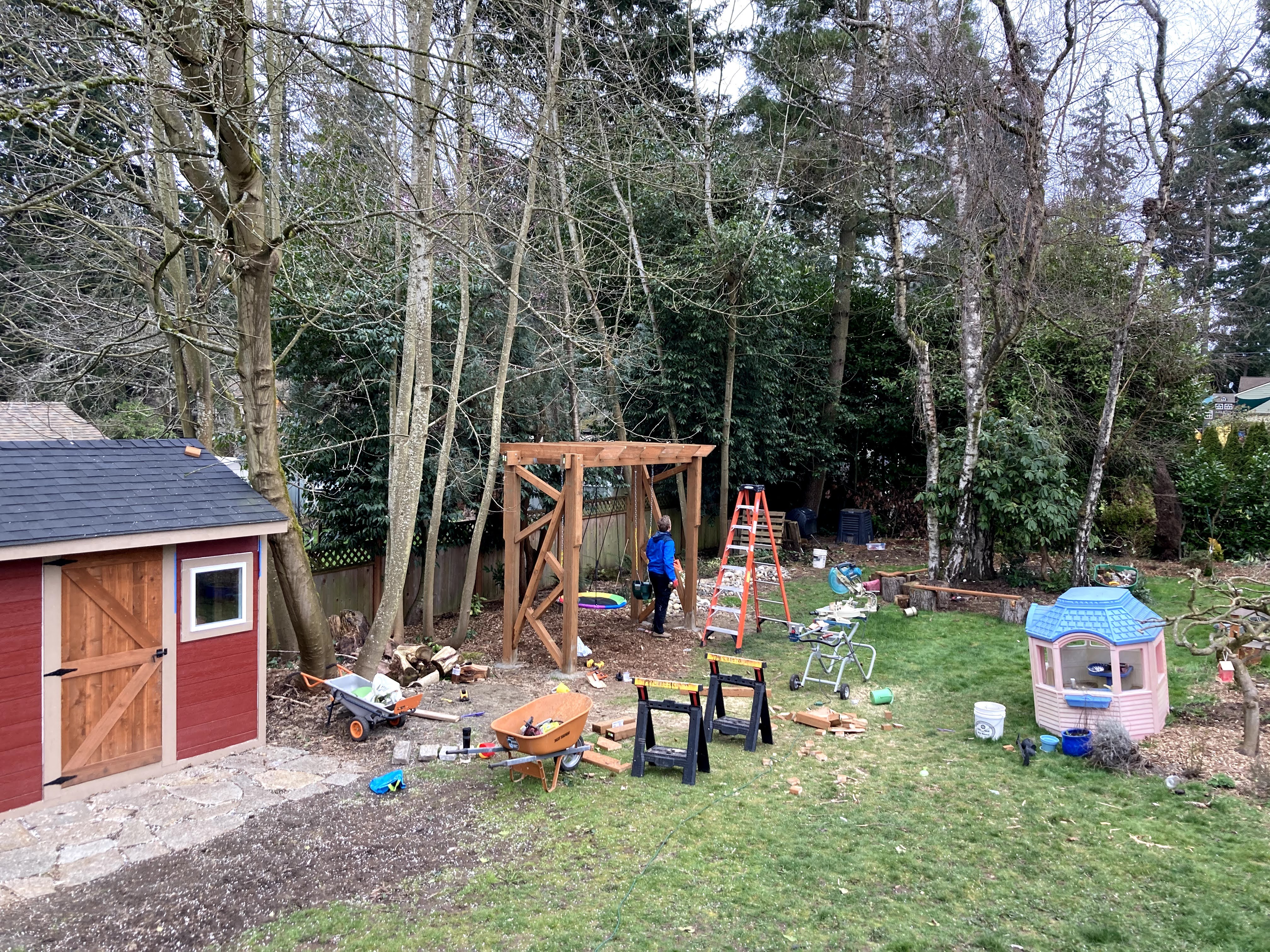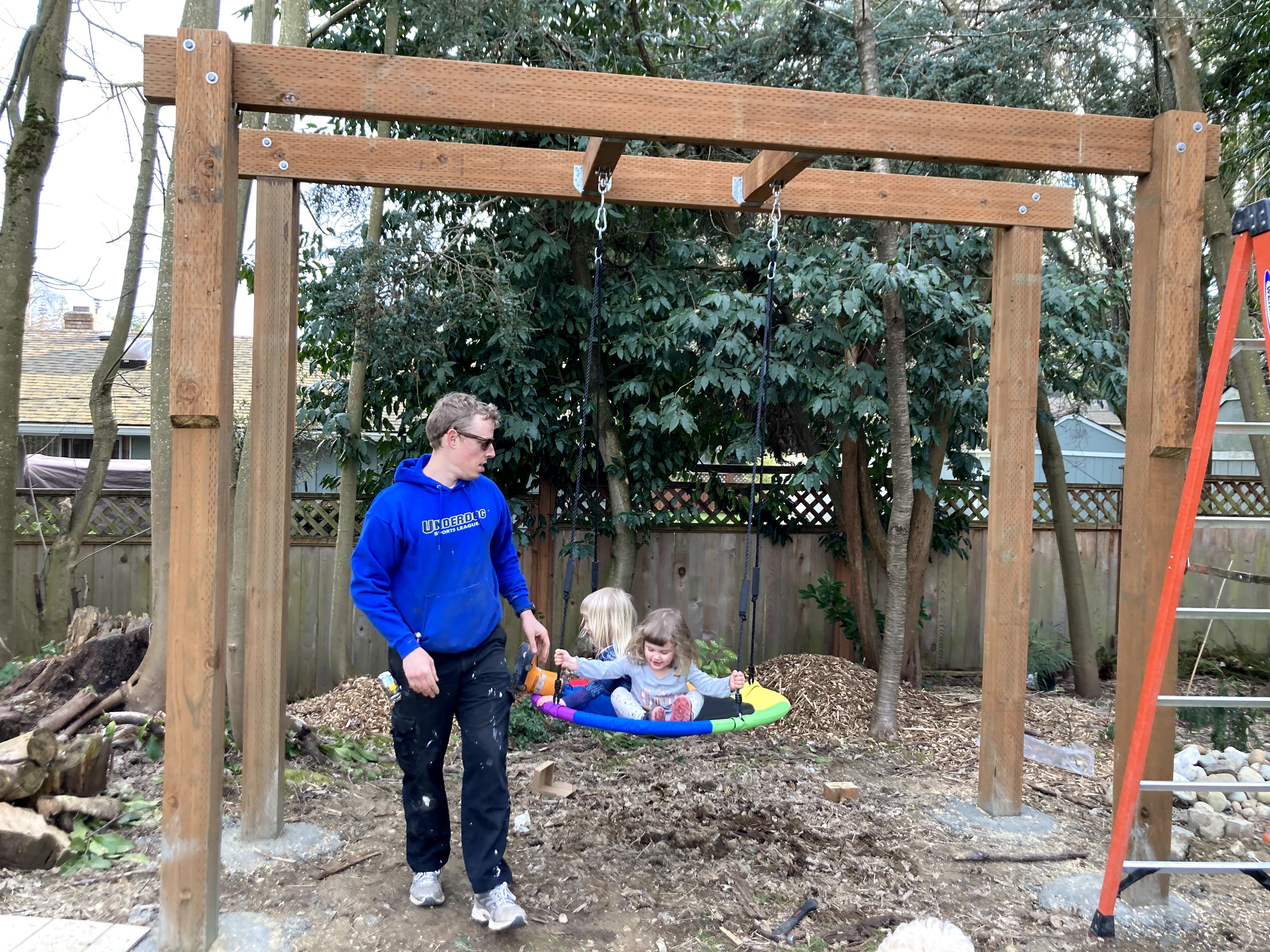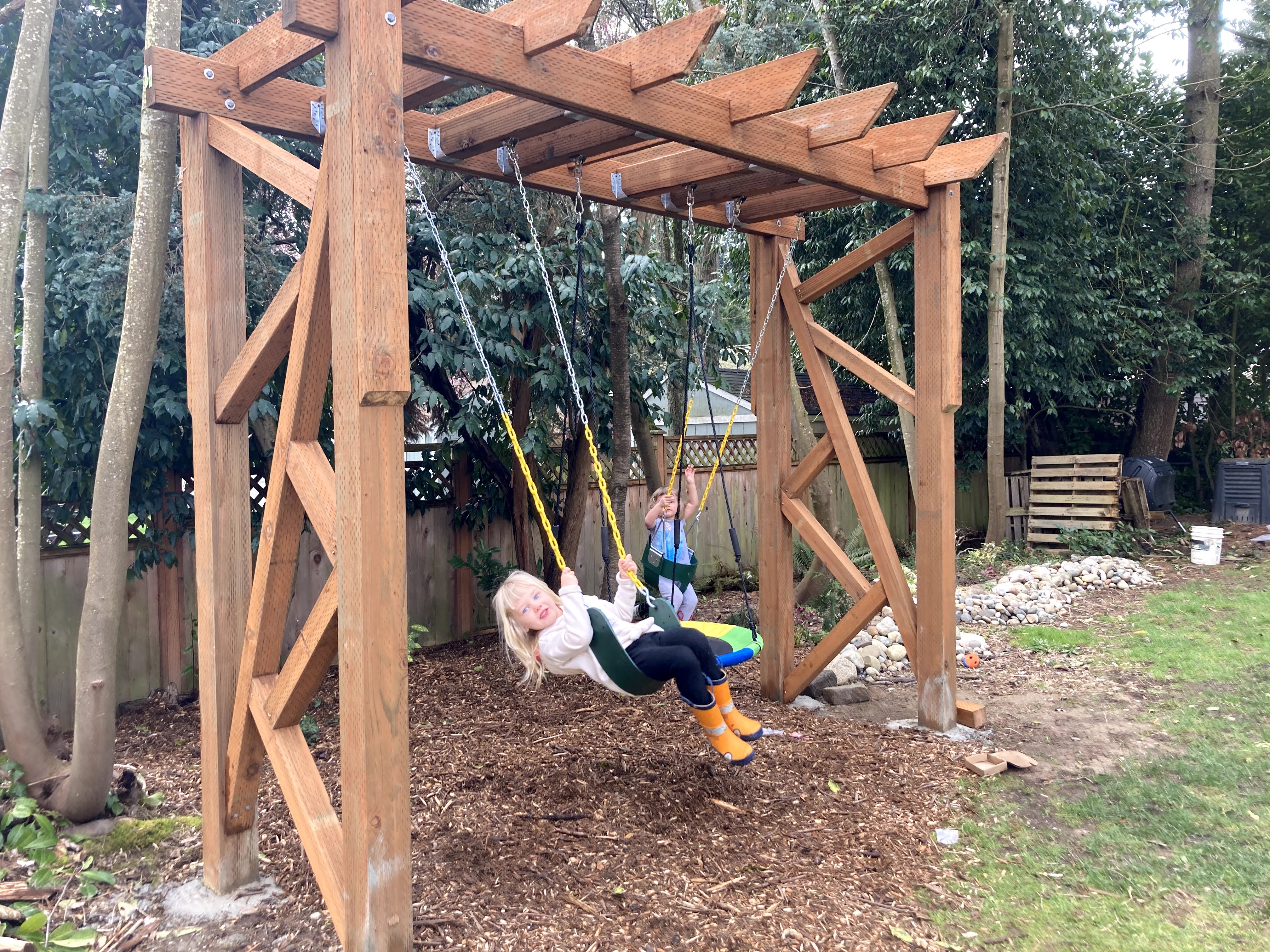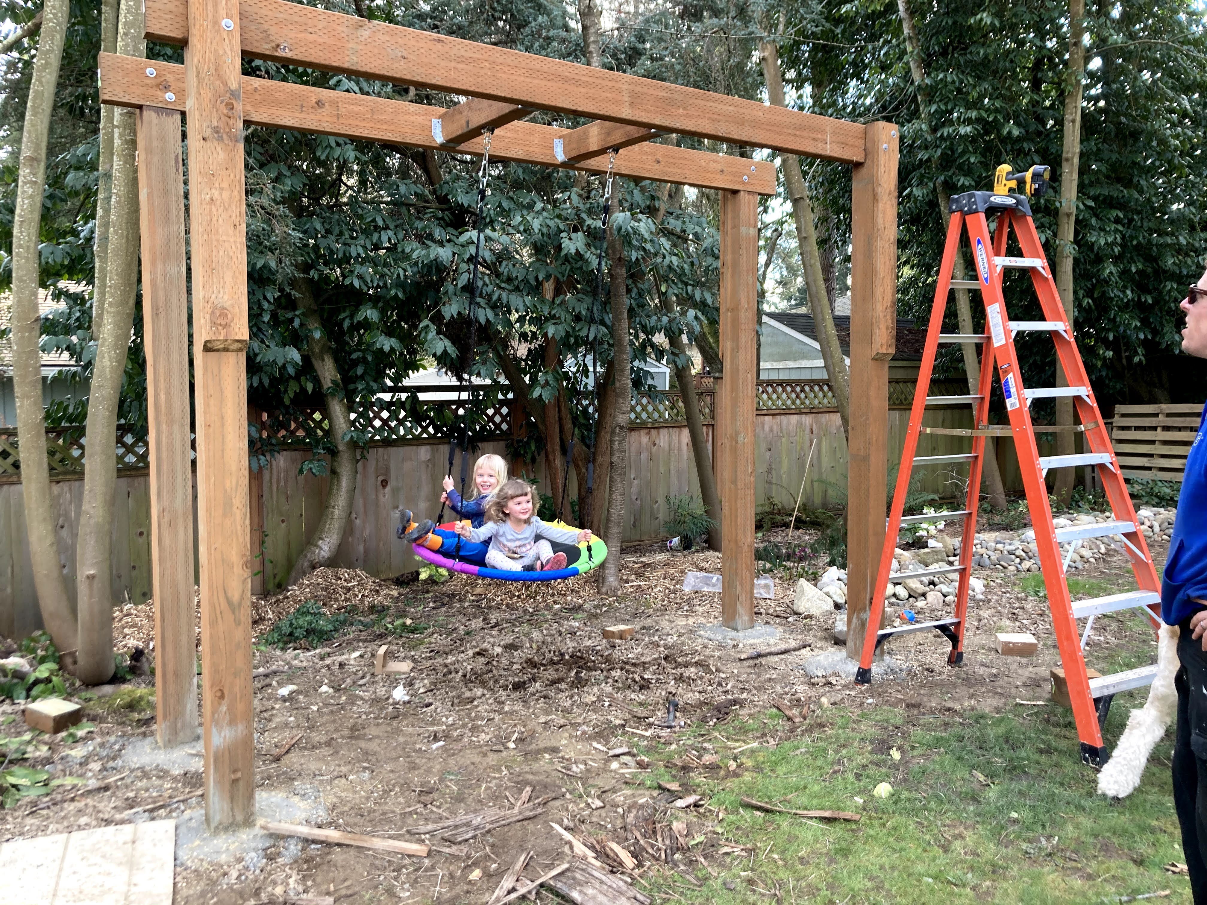 The girls did a test swing so Jon could see if the swing set moved much. While it didn’t move much at all when they were on it, there was definitely movement when Jon and I tried it out. Nothing scary, but we were hoping that once we added the decorative bracing on the sides that it would prevent any more wobbling.