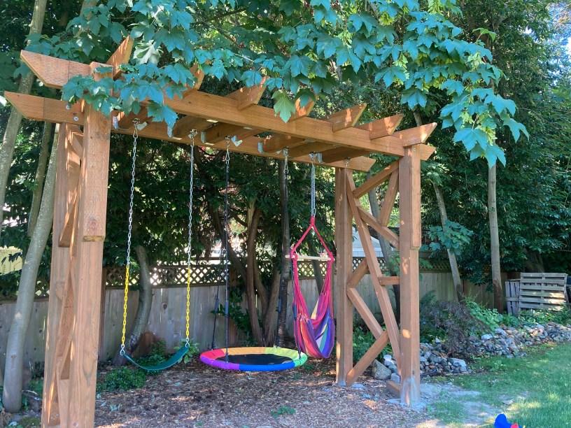 My husband, Jon, was very focused on safety and stability, so he wanted to build an A frame. I was much more interested in aesthetics and long-term functionality in our yard, so I wanted one that looked like a trellis. My rational was that when the girls got a little older and didn’t use the swings anymore, we could hang hammock swings or hanging rattan chairs or even two hammocks between this structure in the summer time for a relaxing and attractive reading nook in the shady section of our yard. Although an A frame would have been cheaper, easier and potentially sturdier, I was able to convince my husband to go for the prettier, multi-purpose build.